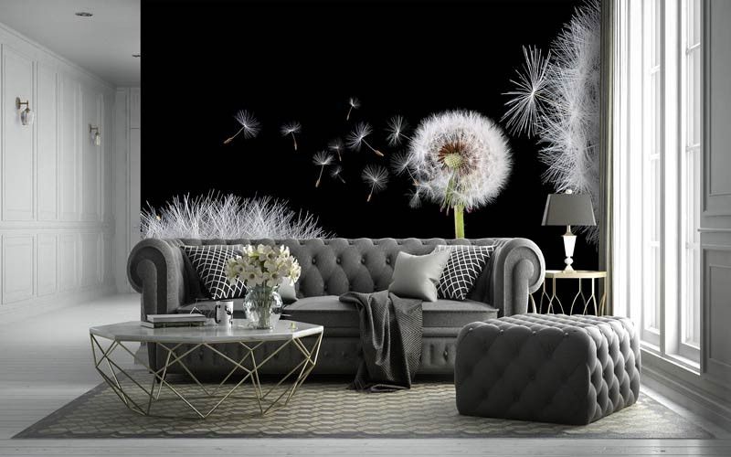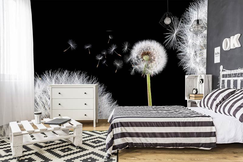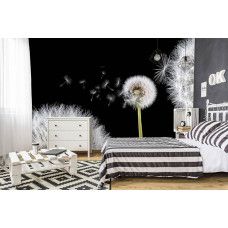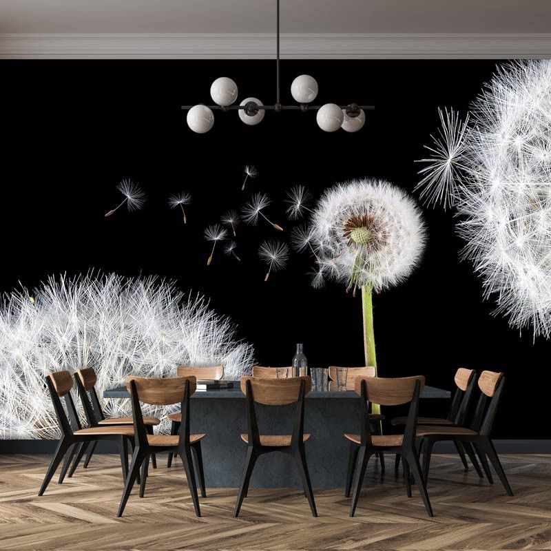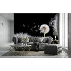 Vlies fotobehang van paardenbloemen weergegeven op een zwarte achtergrond.