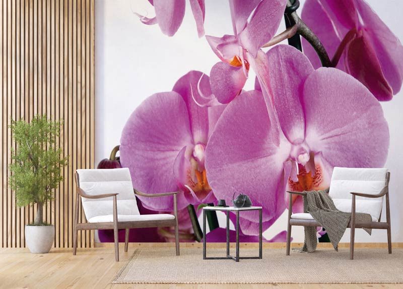 Breng de elegante schoonheid van paarse orchideeën in huis met dit luxe fotobehang. De rijke paarse tinten en subtiele schakeringen maken de bloembladen bijna tastbaar. De hoge kwaliteit van het behang zorgt voor heldere kleuren en haarscherpe details, waardoor de orchidee tot leven komt op de muur. Dit fotobehang is op maat te bestellen, perfect voor woonkamers en slaapkamers die een verfijnde uitstraling willen.