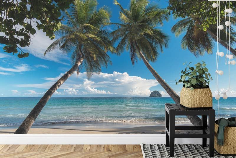 Droom weg onder wuivende palmbomen met Fotobehang Palmbomen aan Zee. Ervaar de tropische pracht van een kustlijn bezaaid met majestueuze palmbomen, terwijl de zachte bries de bladeren doet ritselen.