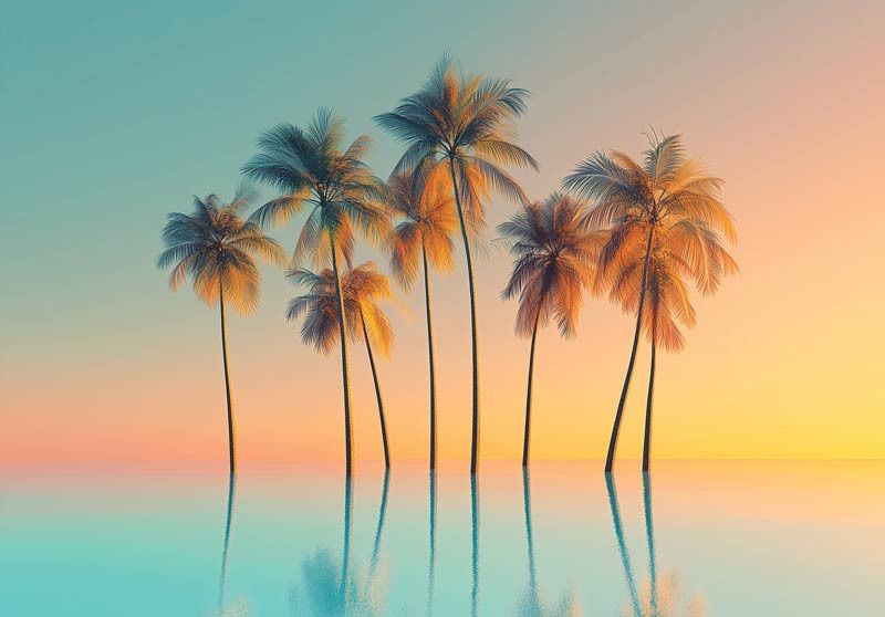 Breng een tropisch gevoel in huis met het fotobehang palmbomen op spiegelend water. Het ontwerp toont een rij elegante palmbomen die weerspiegelen in een rustige wateroppervlakte, met een adembenemende lucht in zachte pastelkleuren. De combinatie van licht, kleur en reflectie creëert een rustgevend beeld dat direct het vakantiegevoel oproept.