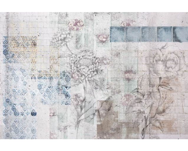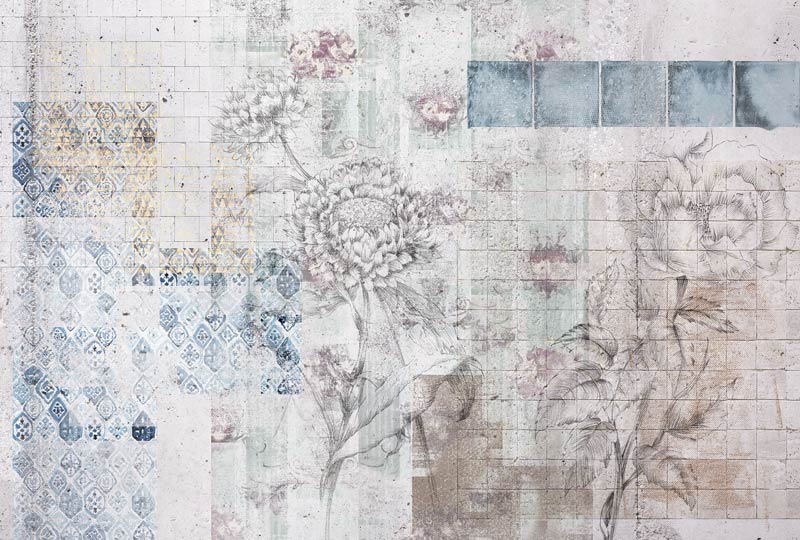 Het stijlvolle retro fotobehang met een collage van bloemen en patronen brengt nostalgische flair in huis.