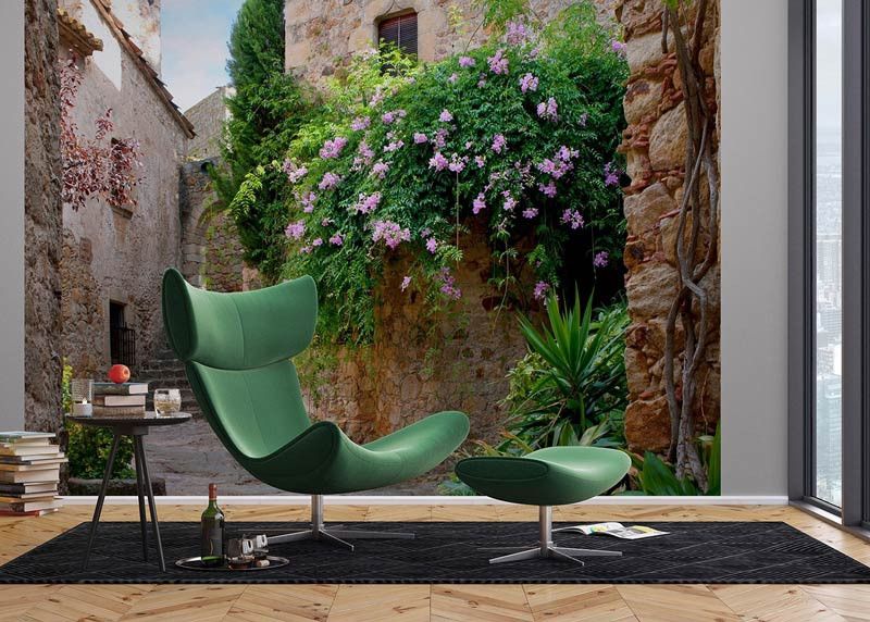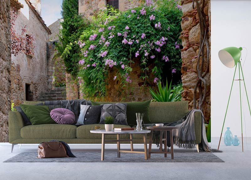 Creëer de sfeer van een rustieke patio met dit fotobehang. De gedetailleerde stenen en het groen eromheen zorgen voor een ontspannen, mediterrane uitstraling. Perfect voor woonkamers, keukens of zelfs buitenruimtes.