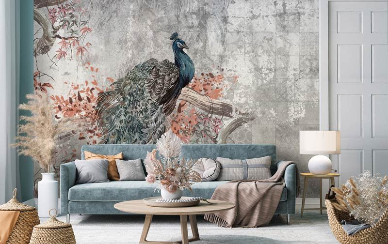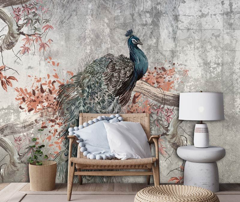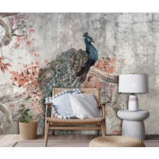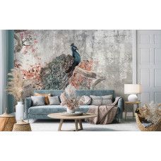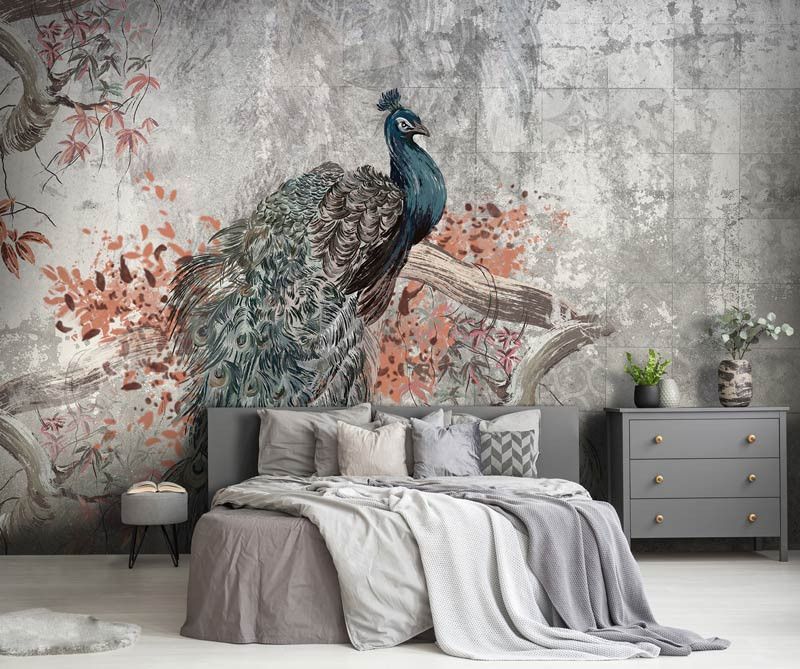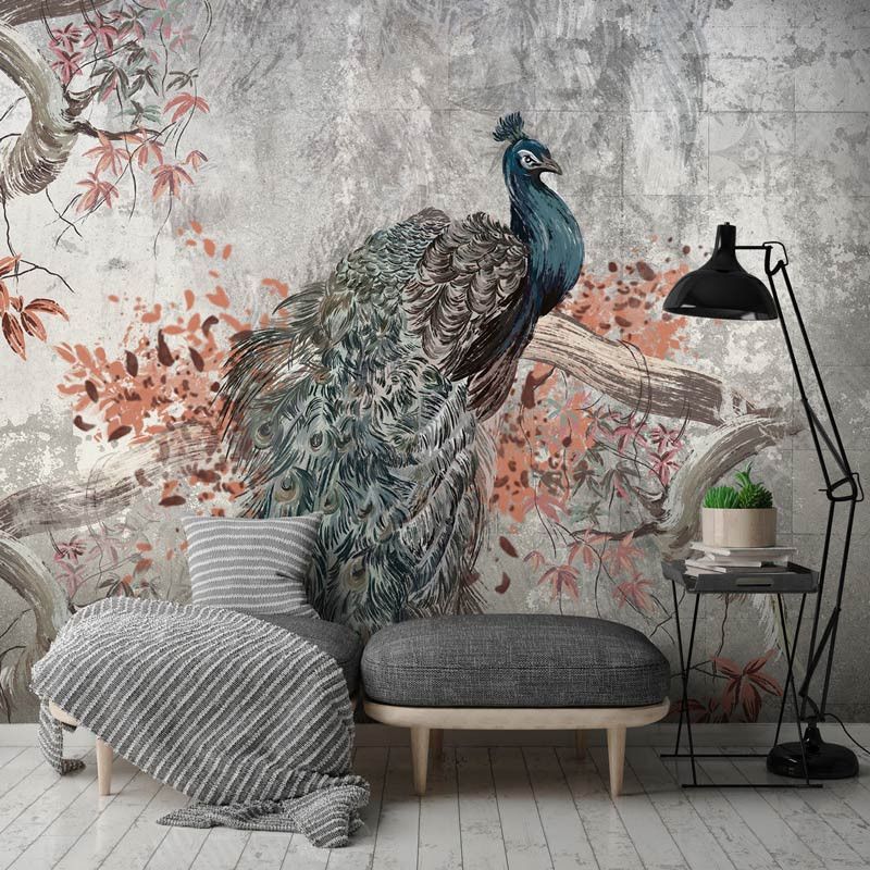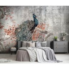 Bestel eenvoudig op maat voor een perfecte pasvorm in elke kamer en geniet van de hoogwaardige afdrukkwaliteit die de diepe kleuren van de pauwveren en de ruwe textuur van het beton prachtig tot leven brengt.