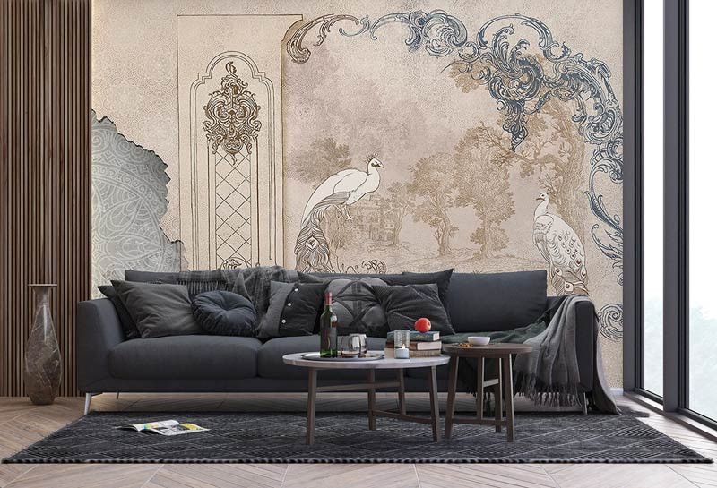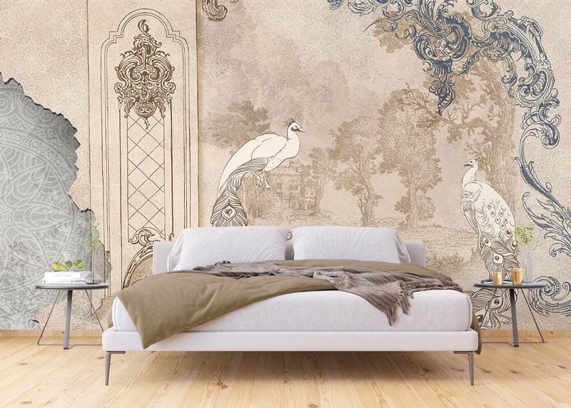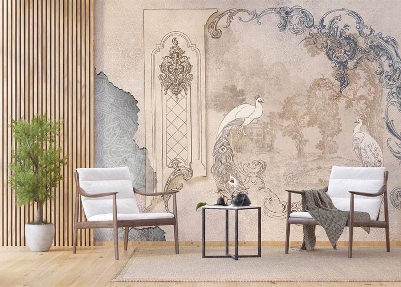 Voeg een vleugje luxe toe met dit Rococo-stijl fotobehang van pauwen. De levendige kleuren en gedetailleerde patronen geven een gevoel van elegantie en kunstzinnigheid. Dit op maat te bestellen behang past prachtig in klassieke en stijlvolle interieurs.
