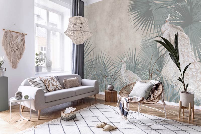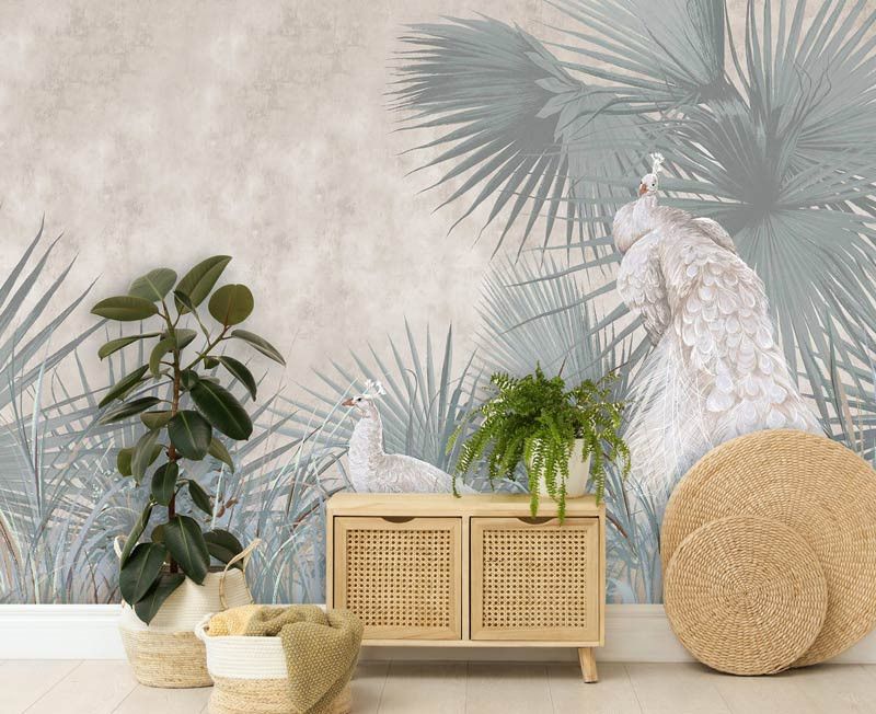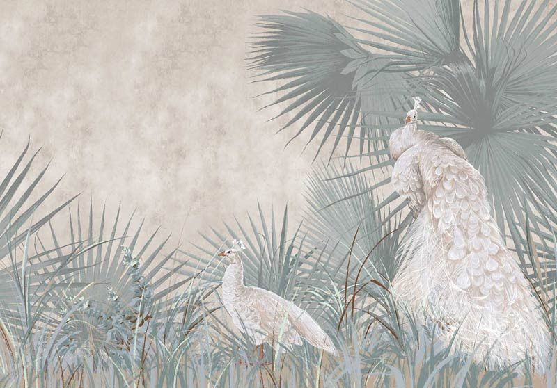 Breng een exotische sfeer in huis met het fotobehang Pauwen in Tropische Oase. De levendige groene tinten van de bladeren en de majestueuze pauwen creëren een oase van rust en luxe. Dit behang is ideaal voor wie een unieke en tropische uitstraling aan het interieur wil geven.