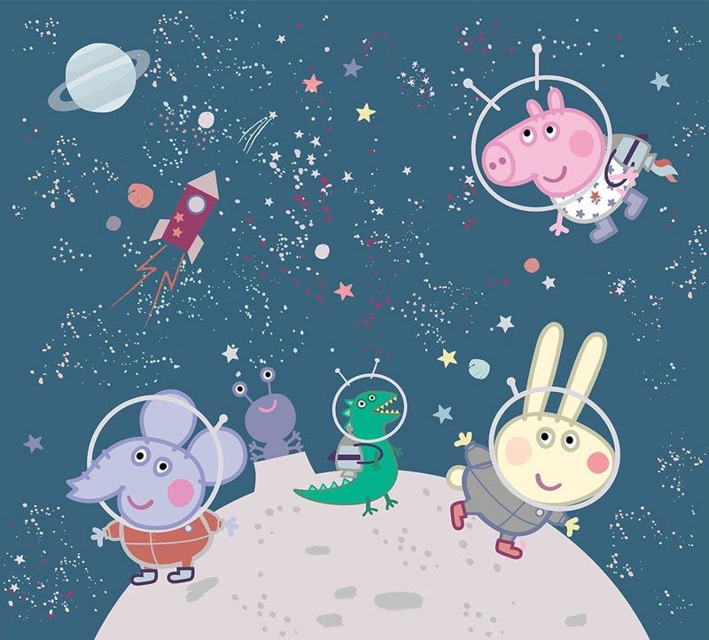 Ga samen met de vriendjes van Peppa Pig op een spannend avontuur door de ruimte! Dit kleurrijke fotobehang toont de vriendjes van Peppa Pig en haar broertje George in hun ruimtepakken, zwevend tussen de sterren en planeten. De vrolijke illustraties en speelse sfeer brengen de fantasiewereld van Peppa Pig rechtstreeks naar de kamer van je kind.