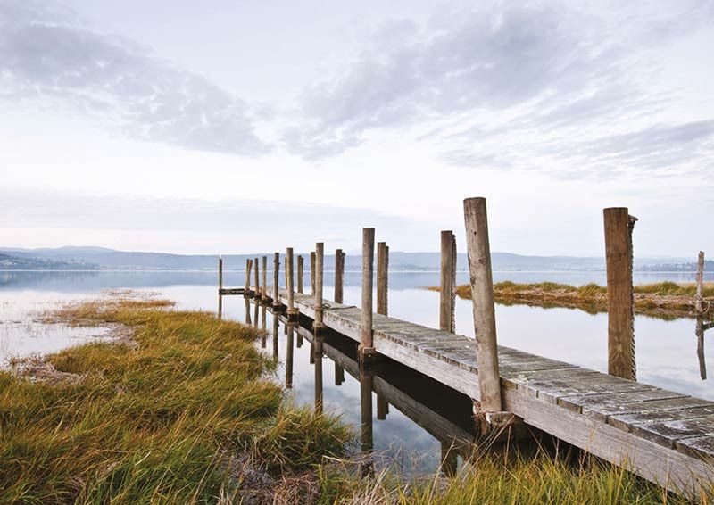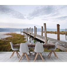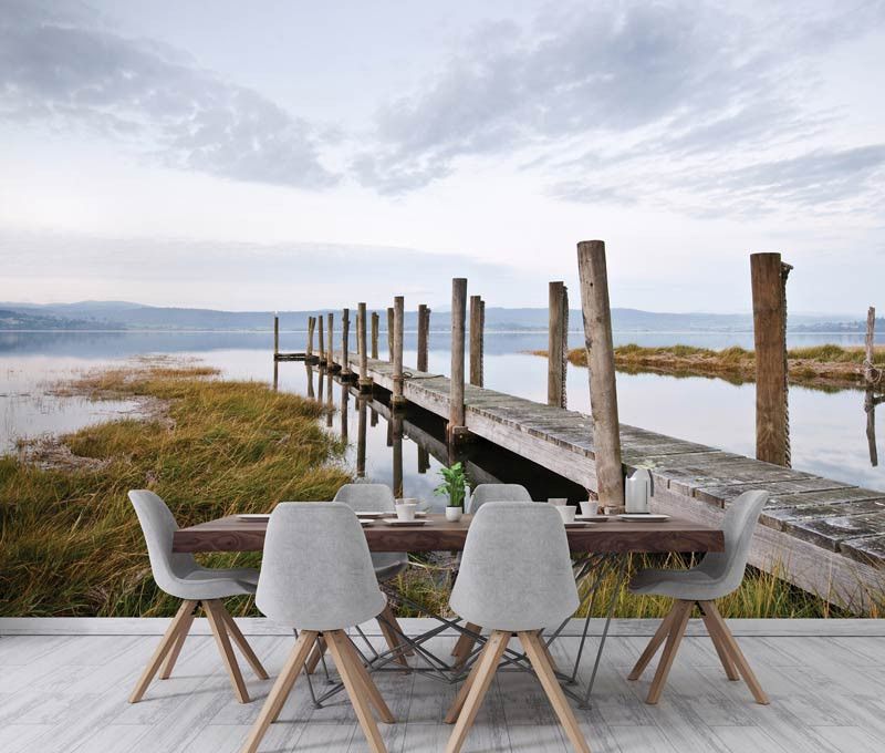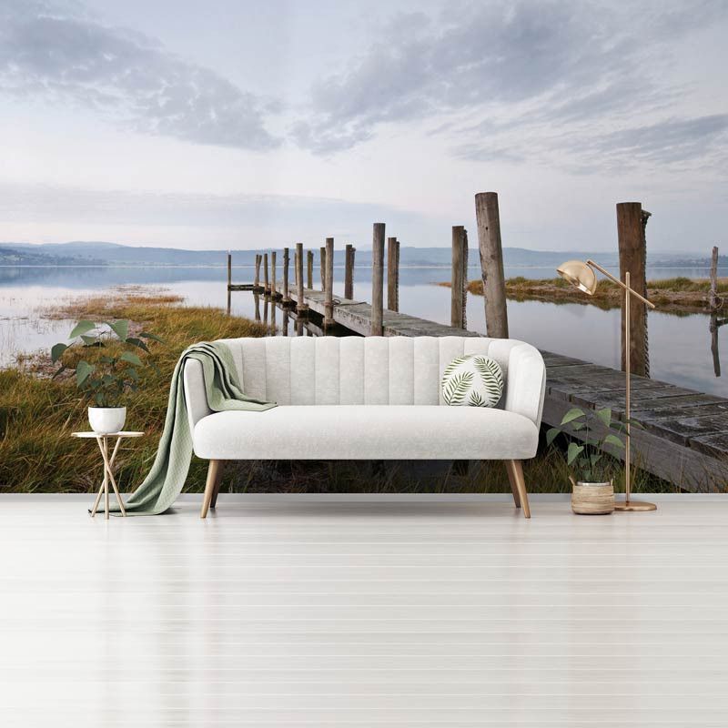 Het fotobehang van de pier aan het meer is een unieke aanvulling op elke ruimte.