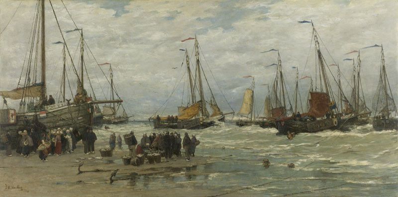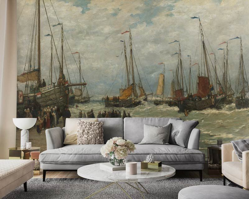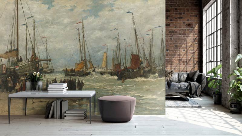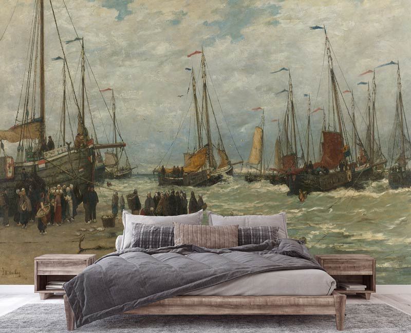 Haal een stukje Nederlandse geschiedenis in huis met het indrukwekkende fotobehang Pinken in de Branding, gebaseerd op het meesterwerk van Hendrik Willem Mesdag. Dit schilderij toont een uniek inkijkje in het vissersleven van Scheveningen rond 1875-1885. De houten schepen, ‘pinken’, liggen op het strand met ankers stevig in het zand, terwijl vissersvrouwen verse vis verhandelen. Deze historische scene brengt een authentieke en rustieke sfeer in je interieur, ideaal voor de woonkamer, kantoor of studeerkamer.