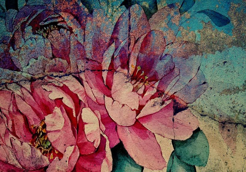 Fotobehang van een schilderij met daarop prachtige pioenrozen.