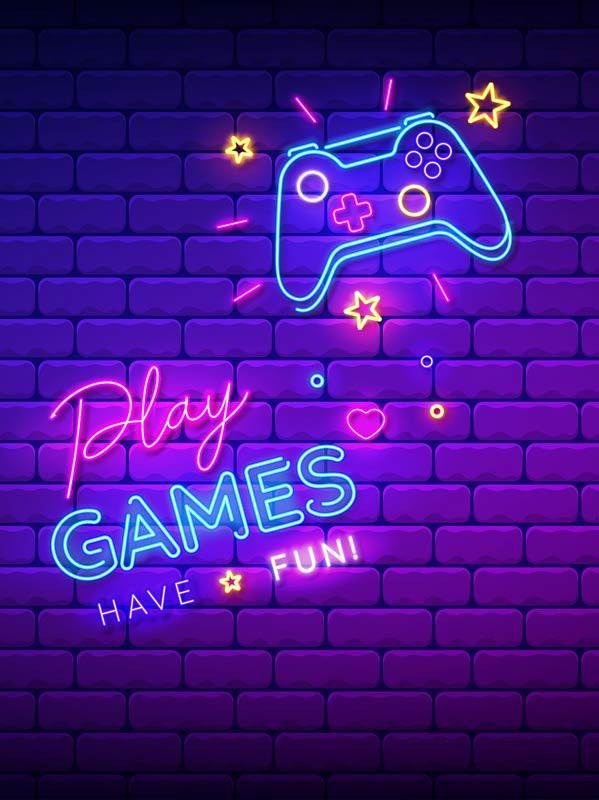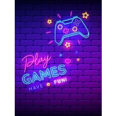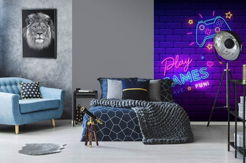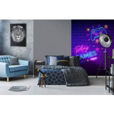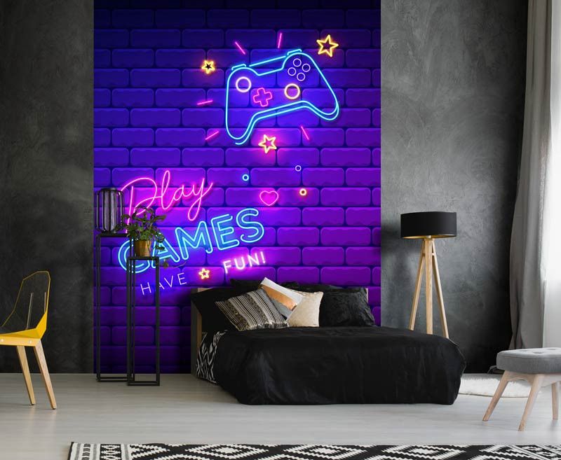 Fotobehang voor de echte gamers. Een neon verlichte muur met een neon gamecontroller en de tekst Play Games in neonletters.