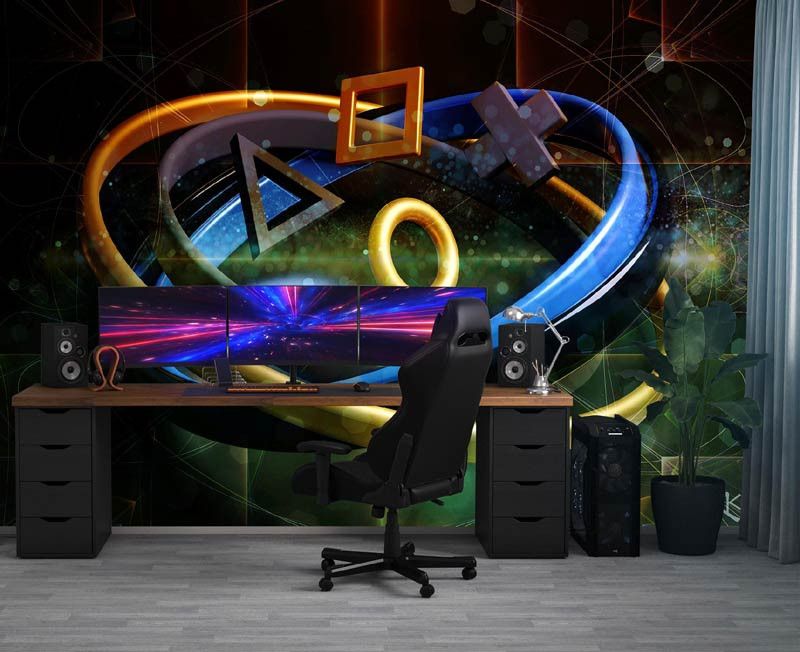 Dompel je onder in de wereld van next-gen gaming met het futuristische Fotobehang PlayStation Universe. Dit unieke ontwerp toont de iconische PlayStation-symbolen – vierkant, driehoek, kruis en cirkel – in het midden van drie ringen, omgeven door een mysterieuze kosmische sfeer. De combinatie van diepe kleuren en lichtaccenten maakt dit behang een must-have voor elke echte gamer.
