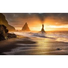 Imposant, wild en dramatisch, de lavakolommen "Reynisdrangar" steken uit in de gloeiende avondlucht op het zwarte zandstrand in IJsland.