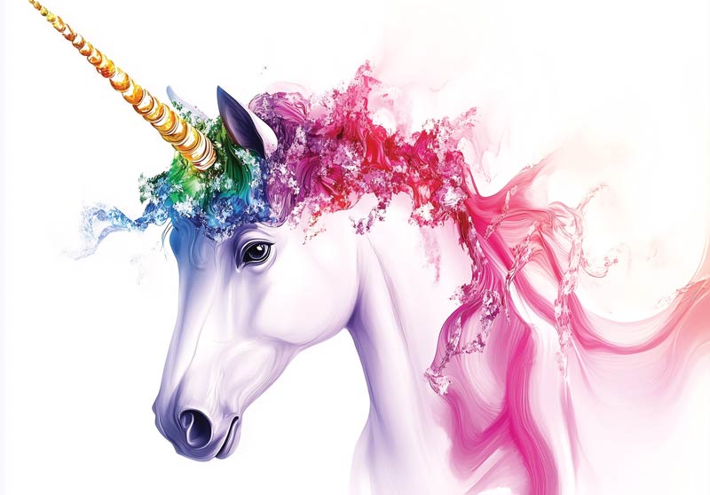 Stap in een wereld vol fantasie met het fotobehang regenboog unicorn. Deze betoverende eenhoorn straalt met een glanzende hoorn en een kleurrijke, vloeiende manen in regenboogtinten. De combinatie van het witte paard en de heldere kleuren zorgt voor een magisch effect dat elke ruimte laat sprankelen.