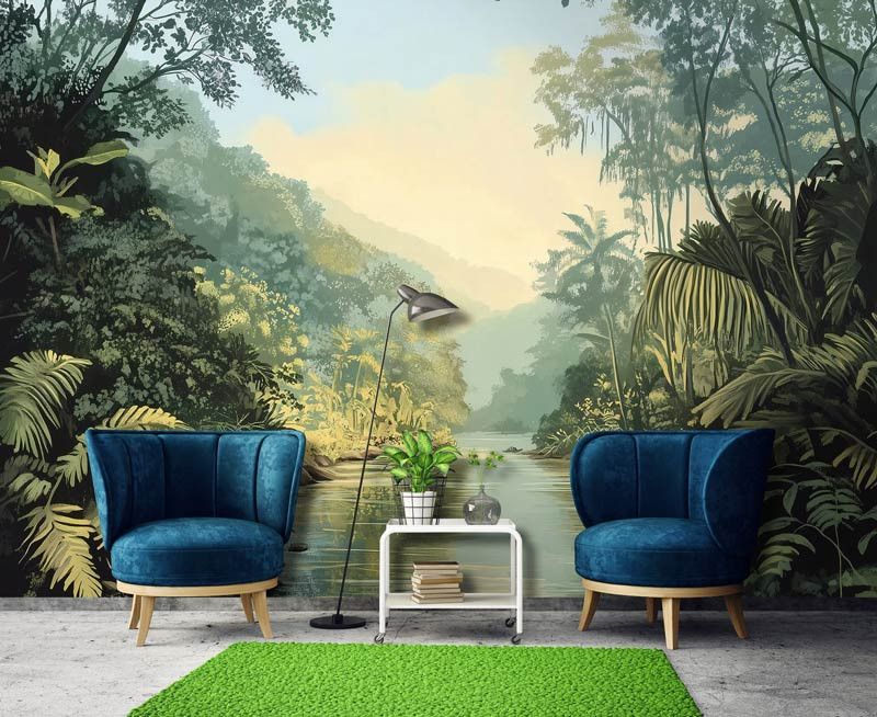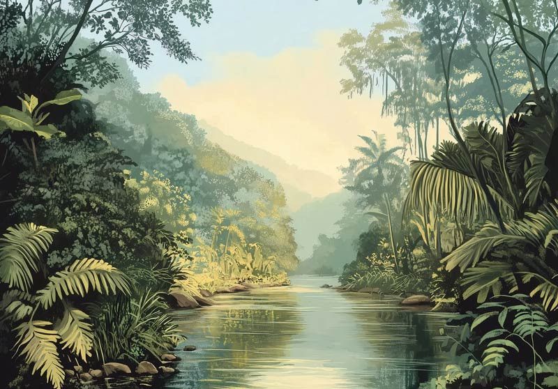 Laat je meevoeren naar een tropisch paradijs met dit fotobehang van een kalme rivier die zich een weg baant door dichte jungle. De diepe groentinten en het spiegelende water zorgen voor een natuurlijke rust.