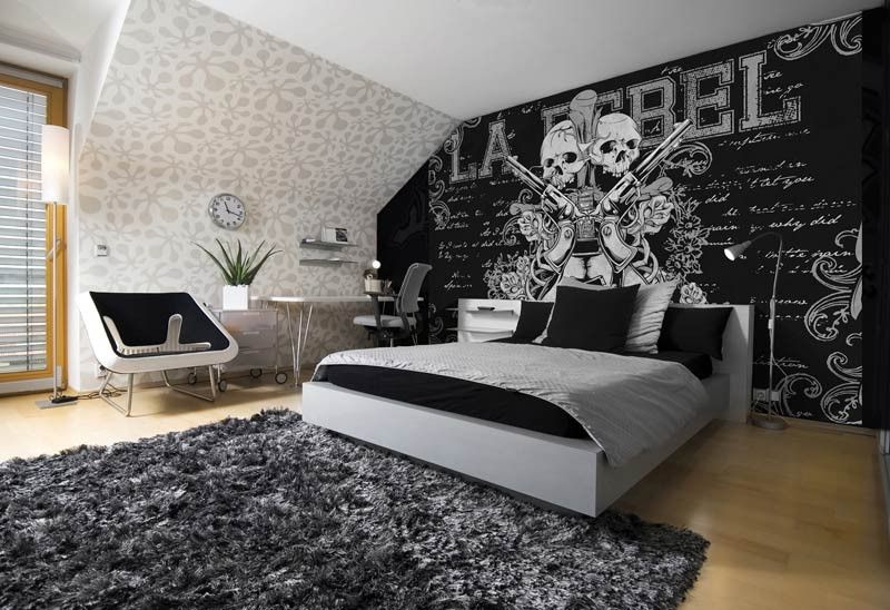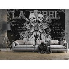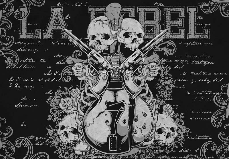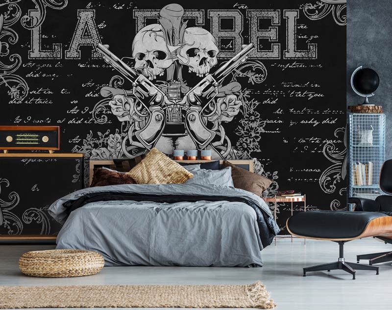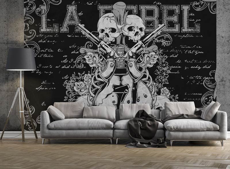 Fotobehang met daarop een kunstwerk met o.a. schedels, pistolen en een gitaar.