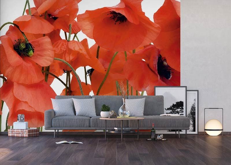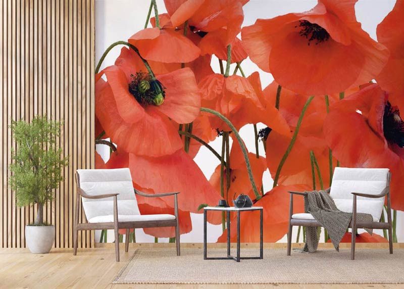 Breng de levendige energie van rode klaprozen in je interieur met dit kleurrijke fotobehang. De felle rode bloemen springen van de muur en vormen een opvallend contrast met het frisse groen van de stelen en bladeren. Deze intense kleuren geven elke kamer een warme, uitnodigende sfeer.