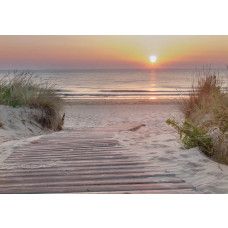 Laat je meevoeren door de warme kleuren van de avond met ons Fotobehang Romantische Zonsondergang aan het Strand. Dit betoverende fotobehang toont een idyllisch tafereel van een houten strandpad dat tussen de duinen doorloopt richting het strand, terwijl de zon langzaam in de zee zakt. De lucht kleurt in tinten oranje en goud, wat een sfeervolle en romantische ambiance creëert voor elke ruimte.