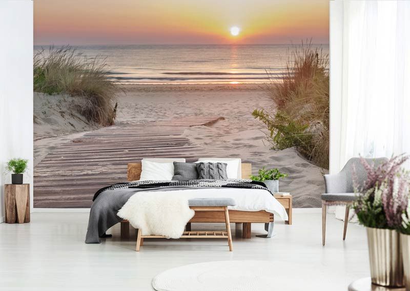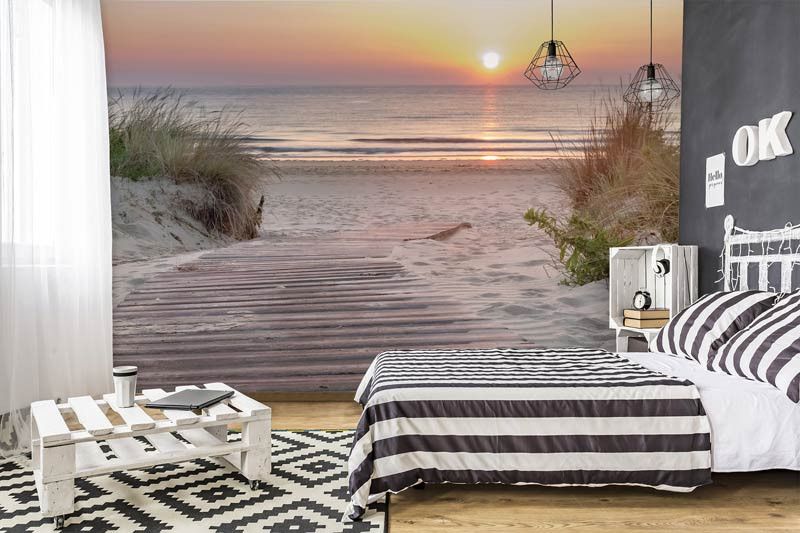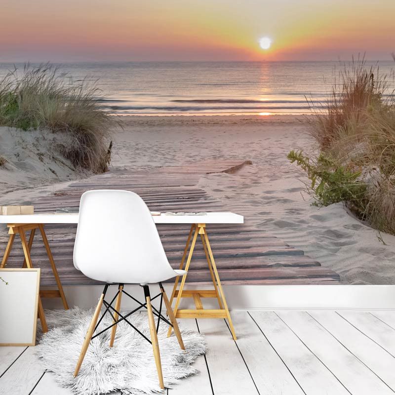 Het behang is eenvoudig op maat te bestellen. Vul de gewenste maten in en kies het mooiste deel van de print dat aansluit bij jouw interieur. Dankzij de haarscherpe details komen het spel van licht in de lucht, de structuur van het zandpad en de zachte vormen van de duinen prachtig tot leven. Met dit fotobehang breng je de rust, schoonheid en magie van een zonsondergang aan zee in huis.