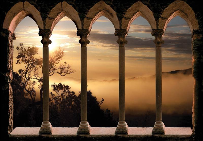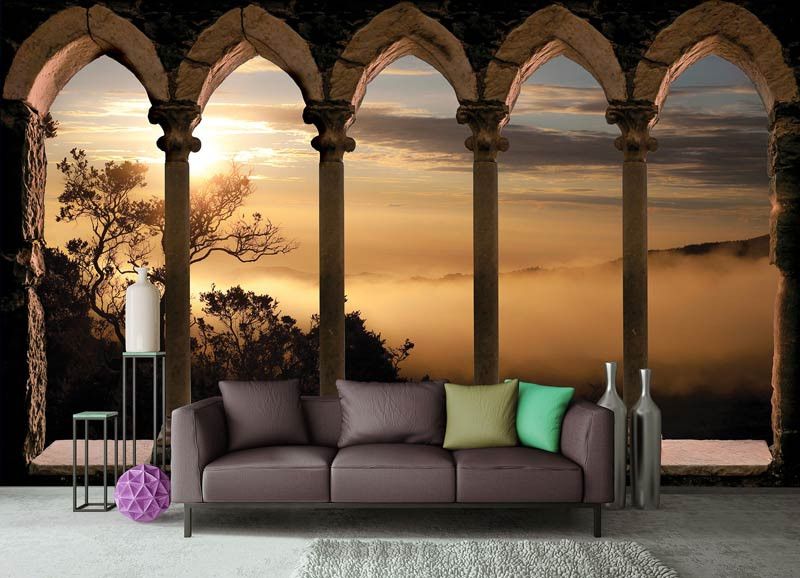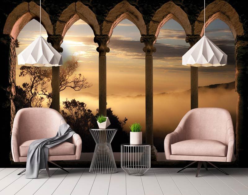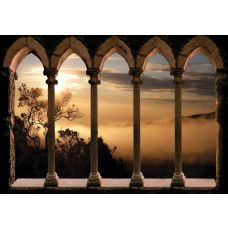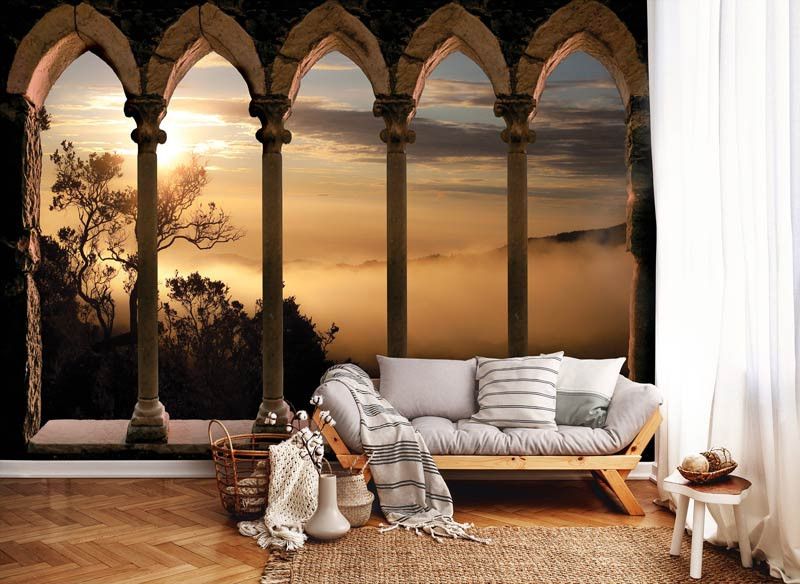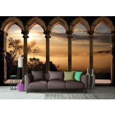 Met dit prachtige 3D vlies fotobehang lijkt het net alsof je vanuit je Romeinse paleis, tussen de gigantische pilaren door, op het mistige landschap uitkijkt!