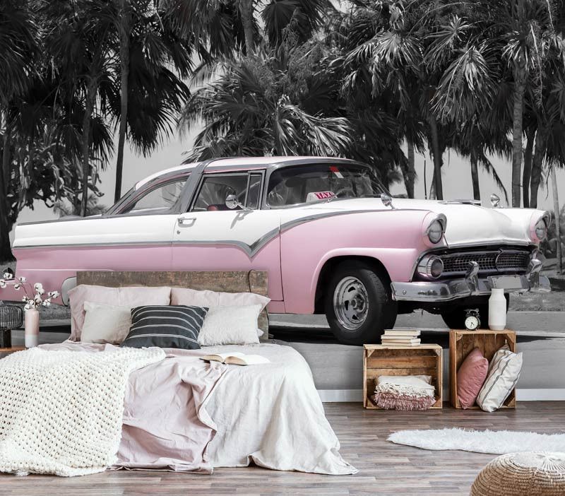 Het fotobehang van de roze auto is een echte eyecatcher en is de perfecte aanvulling op iedere ruimte.