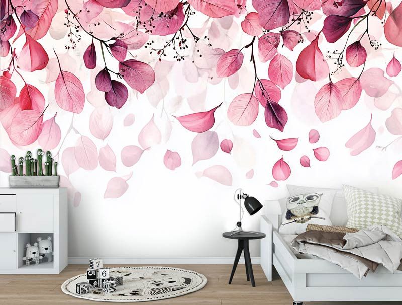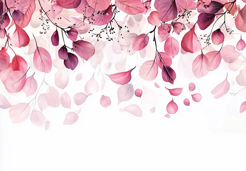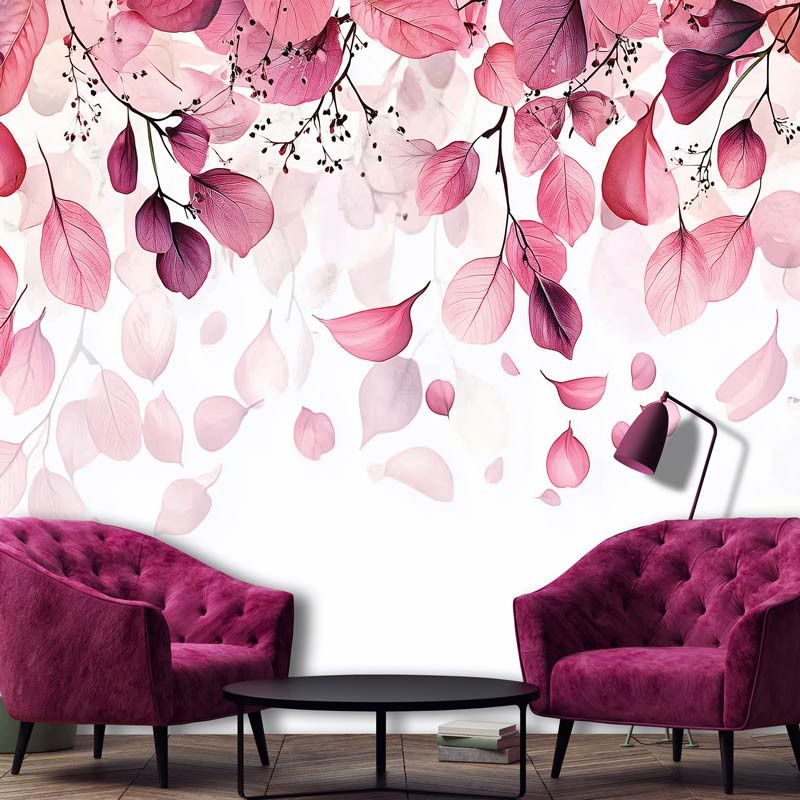 Voeg een zacht en speels accent toe aan je interieur met dit fotobehang van roze bladeren in aquarelstijl. De lichte tinten en verfijnde vormen geven een romantisch en fris gevoel aan de ruimte.