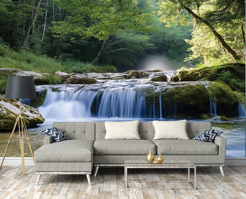 Haal de kalmte van de natuur naar binnen met dit prachtige fotobehang. Het ontwerp toont een heldere waterval die zacht over met mos begroeide rotsen stroomt, omgeven door een weelderig groen bos. Het zachte licht dat door de bomen valt, versterkt de serene en frisse uitstraling van dit betoverende natuurtafereel. Ideaal voor woonkamers, slaapkamers of kantoren waar je een rustgevend en verfrissend accent wilt toevoegen.