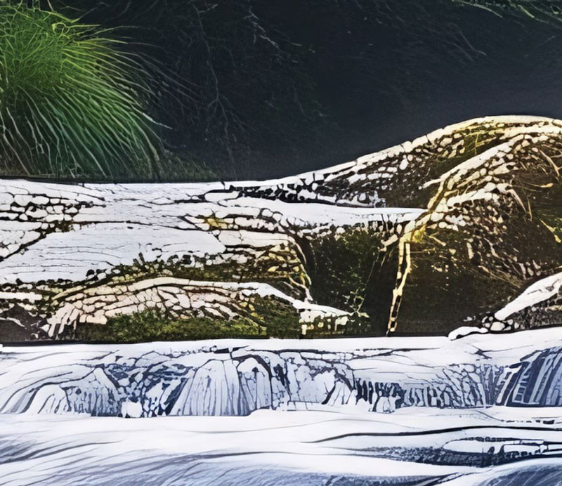 Breng een artistieke interpretatie van de natuur in huis met dit bijzondere fotobehang. Het ontwerp toont een waterval in een kunstzinnige, schilderachtige stijl, waarbij stromend water en rotsformaties zijn weergegeven met abstracte structuren en verfachtige texturen. De combinatie van lichte en donkere tinten geeft het geheel een rustige en moderne uitstraling.