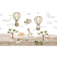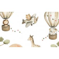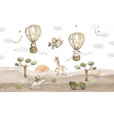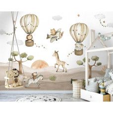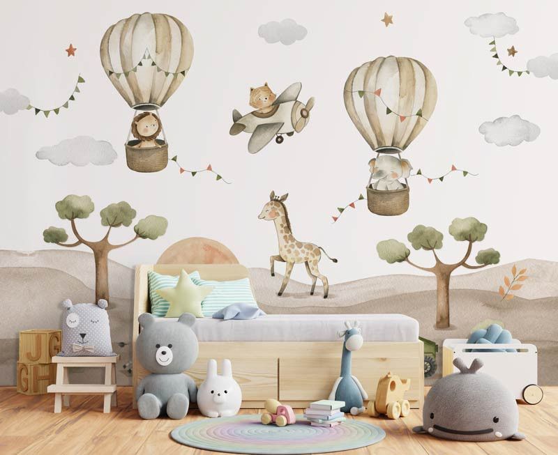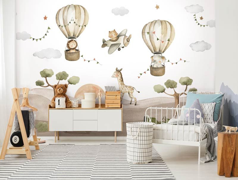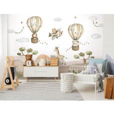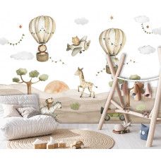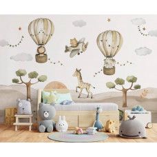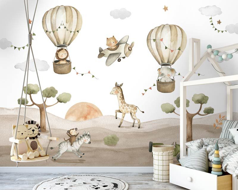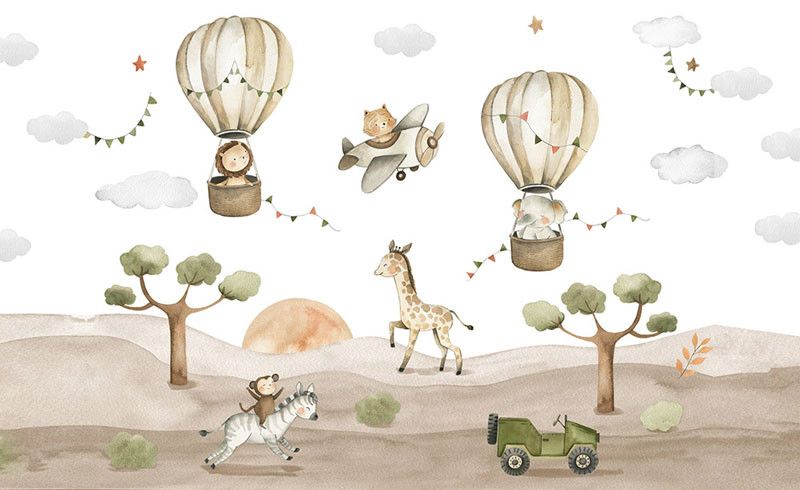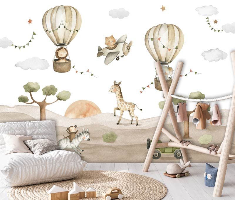 Op de grond staan ook een dieren zoals een aap op een zebra en een giraffe die rustig door de savanne beweegt. De dieren in dit behang hebben vriendelijke gezichten en warme, zachte tinten, waardoor een gezellige en kindvriendelijke sfeer ontstaat. Het ontwerp prikkelt de verbeelding en geeft de kamer een unieke uitstraling waarin kinderen zich veilig en blij voelen.