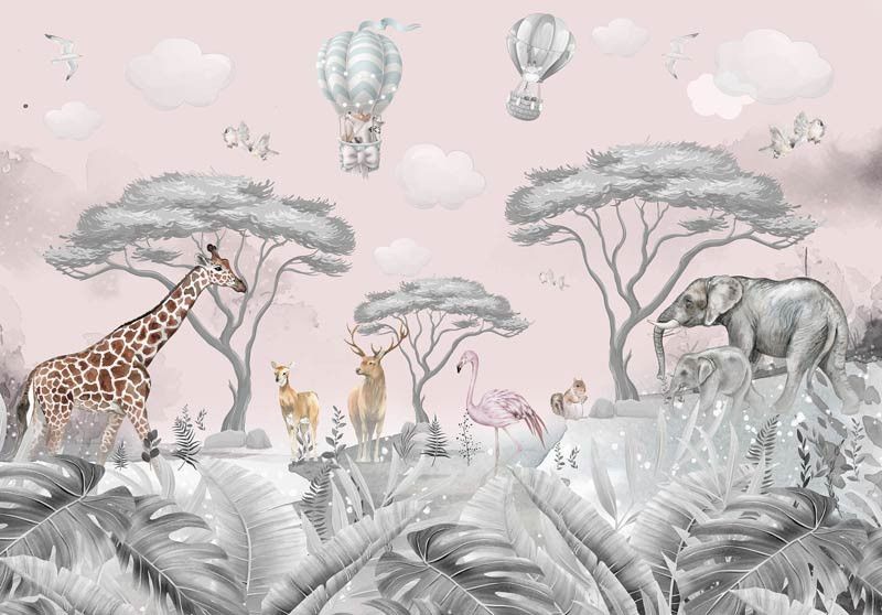 Haal de natuur naar binnen met het fotobehang Safari- en Bosdieren Vriendjes. Dit schattige ontwerp toont een groep vriendelijke dieren, zoals olifanten, herten en een giraffe, omringd door bomen en planten. Perfect om de kinderkamer een avontuurlijke en speelse uitstraling te geven.