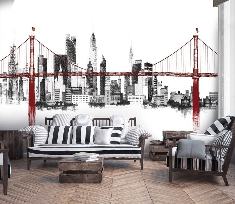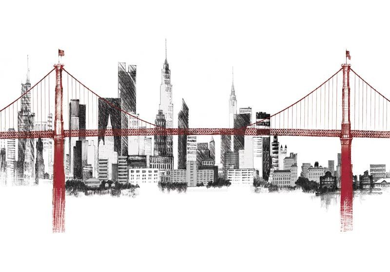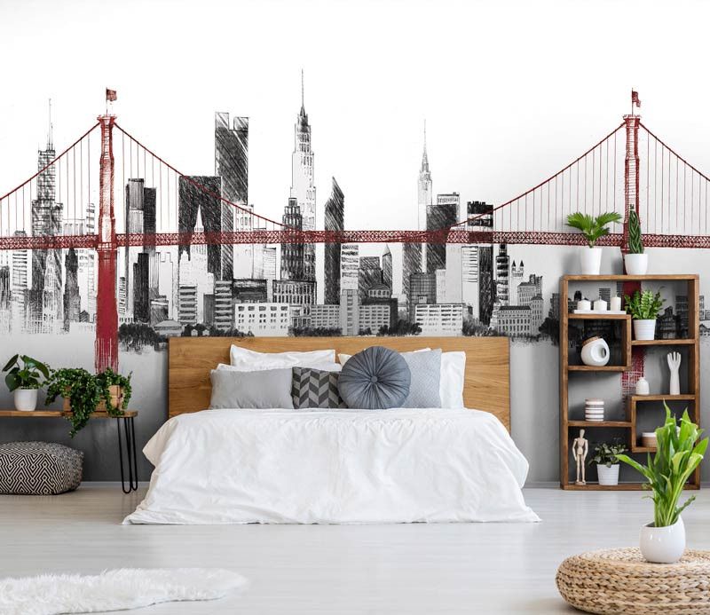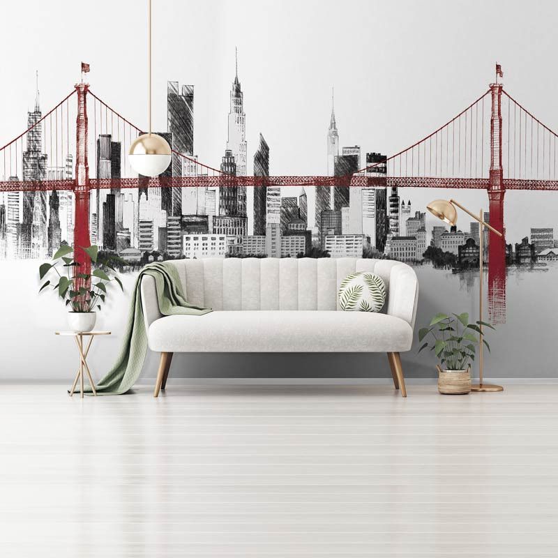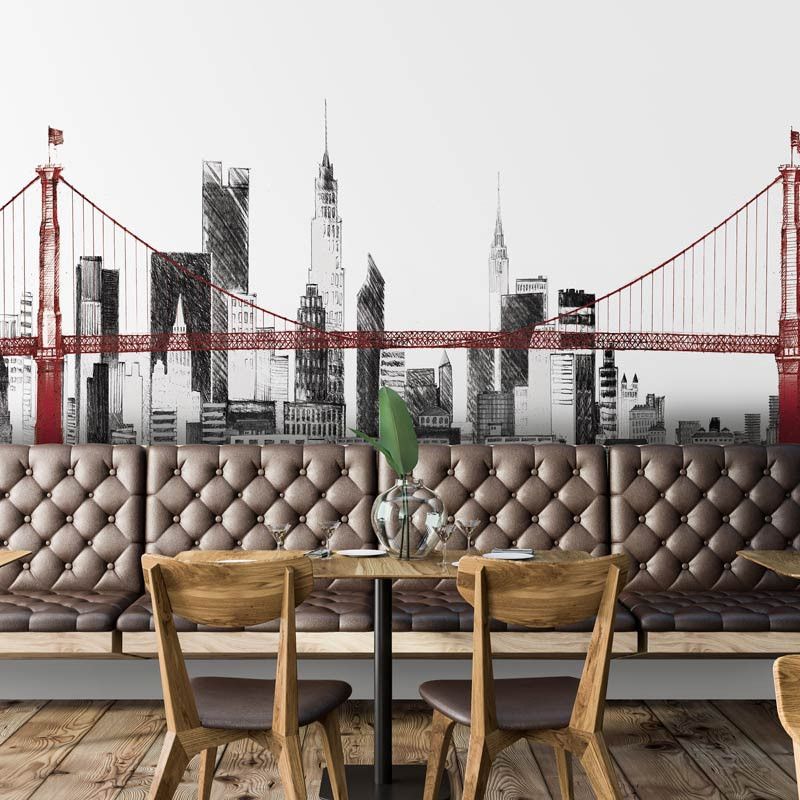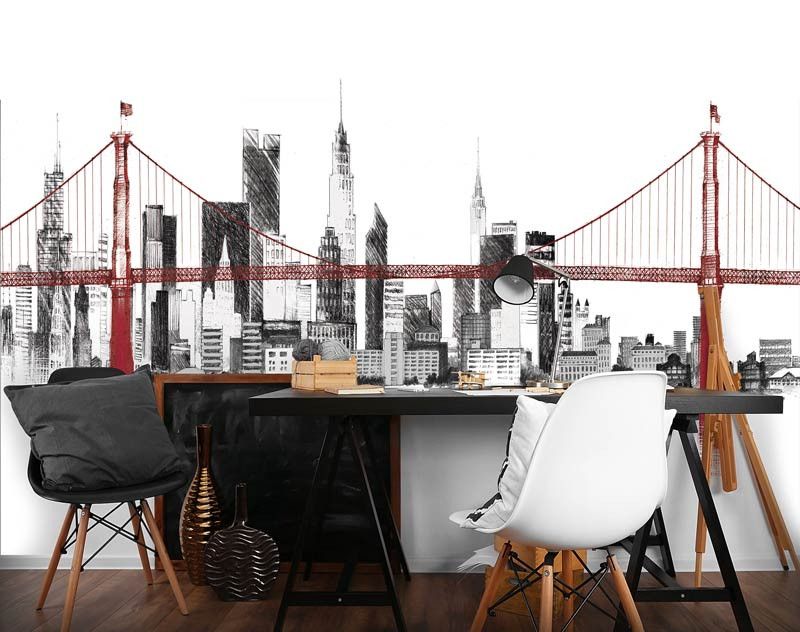Geniet van een adembenemend uitzicht met het fotobehang Schilderachtige Brug en Skyline. Het verfijnde ontwerp combineert een majestueuze brug met een indrukwekkende skyline, wat een perfect evenwicht tussen natuur en architectuur biedt.