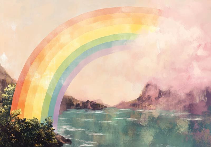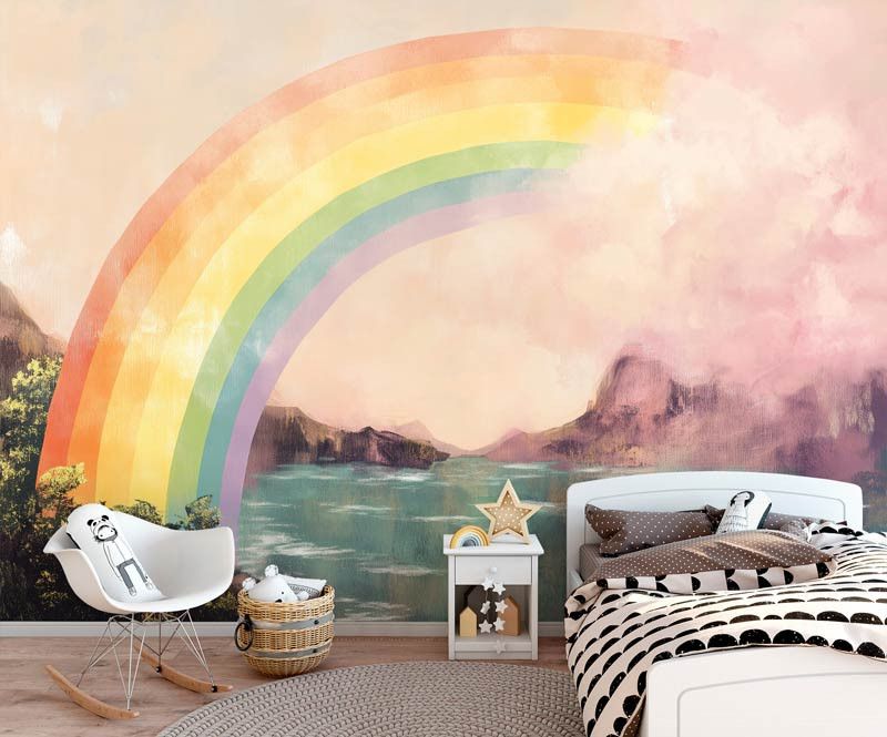Breng een vleugje magie en kleur in de kinderkamer met dit dromerige fotobehang. Het ontwerp toont een grote, schilderachtige regenboog die zich uitstrekt over een zacht waterlandschap en bergen, met pastelroze wolken die een warme en fantasierijke sfeer creëren. De subtiele penseelstreken geven het behang een artistieke en speelse uitstraling die perfect past in kinderkamers en creatieve ruimtes.