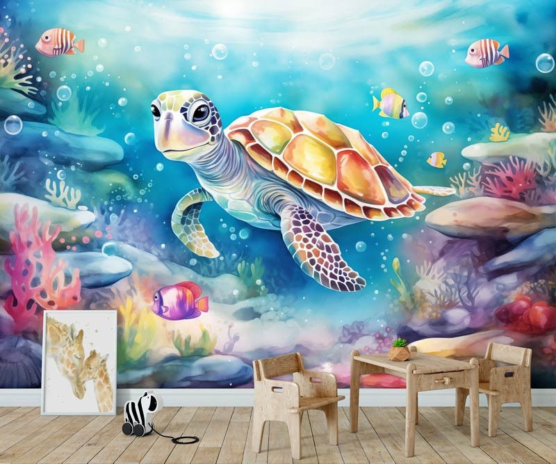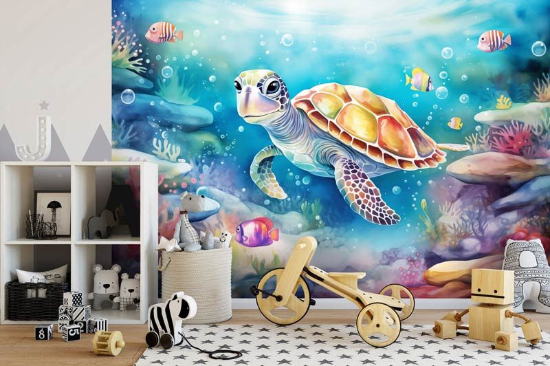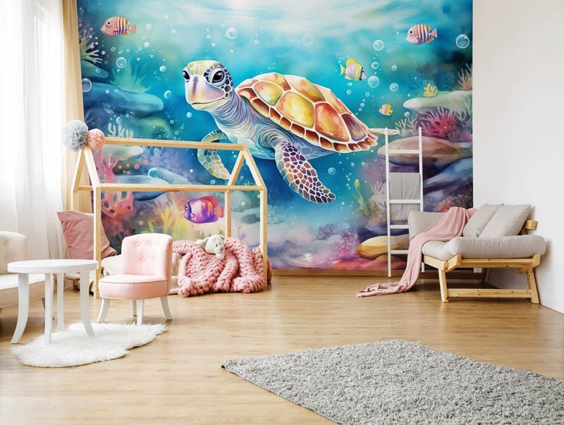 Laat de magie van de oceaan tot leven komen in de kinderkamer met ons Fotobehang Schildpad in Zee. Dit betoverende fotobehang toont sierlijke schildpadden die zwemmen in kristalhelder water, waardoor een gevoel van rust en verwondering ontstaat. Het brengt de schoonheid van de onderwaterwereld rechtstreeks naar de muren van de kinderkamer.