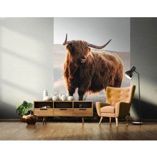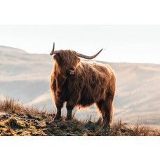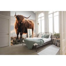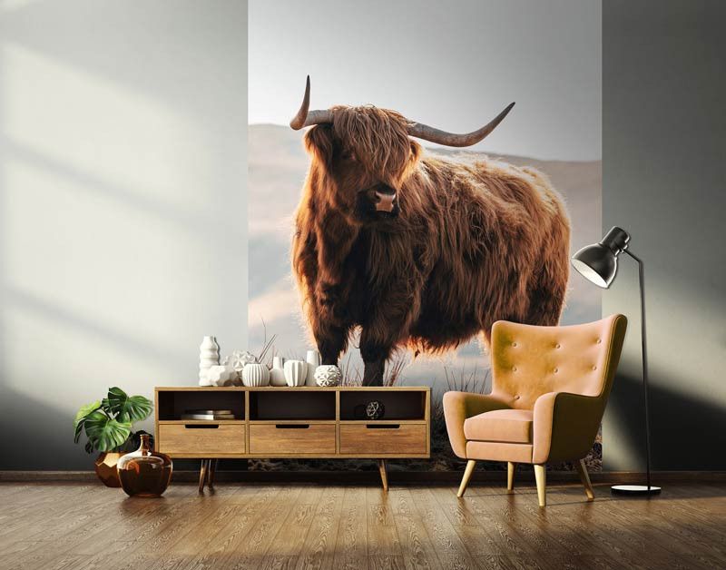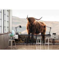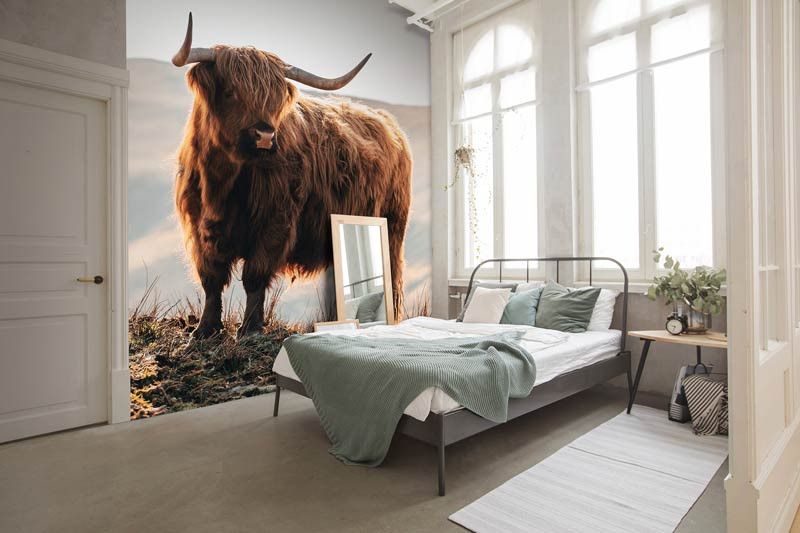 Het kunstwerk toont een majestueuze Schotse hooglander in een landschap van bergen, waardoor het een rustgevende aanblik biedt. De heldere kleuren maken het Schotse hooglander fotobehang tot een echte blikvanger in uw huis.