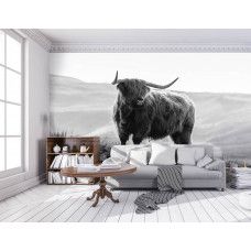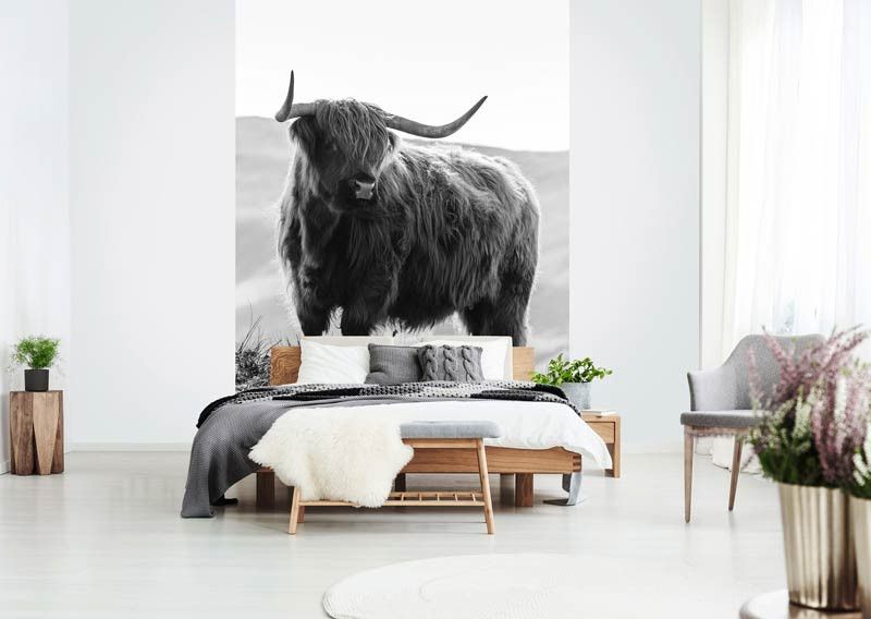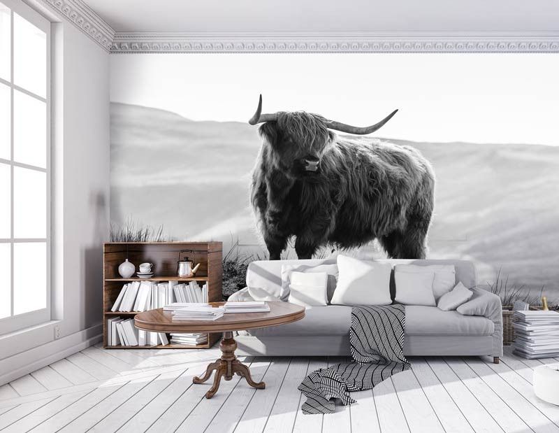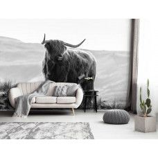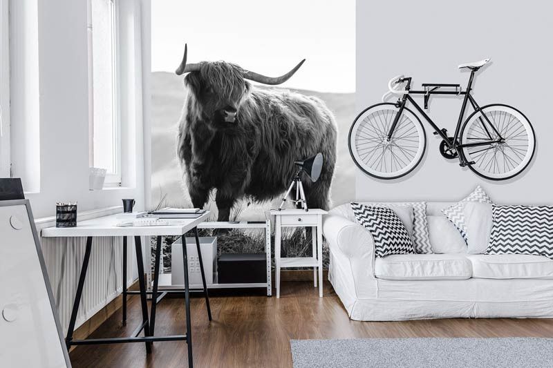 Ontdek het adembenemende landschap van de Amerikaanse prairie met ons prachtige Schotse hooglander fotobehang in zwart-wit.