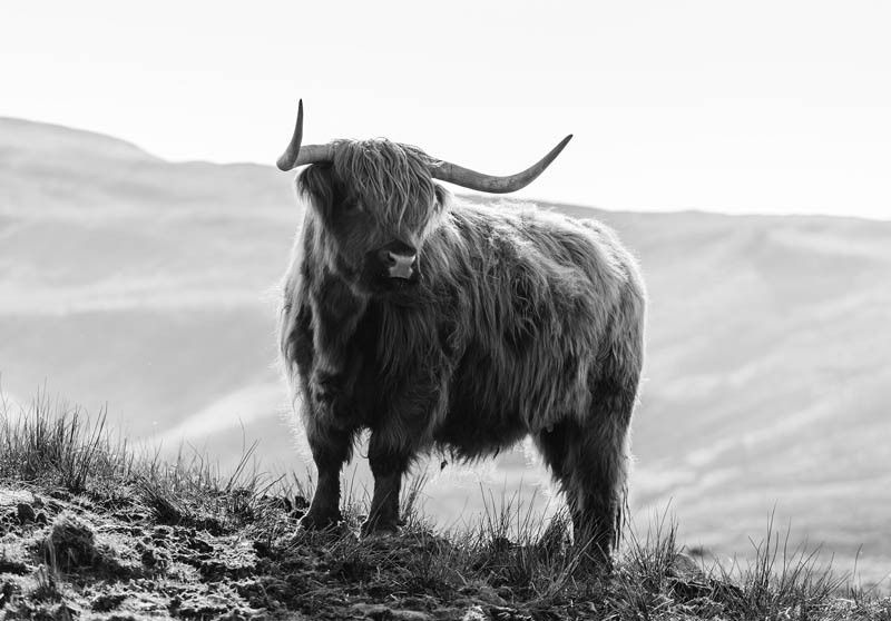 Fotobehang Schotse Hooglander in de Bergen zwart-wit