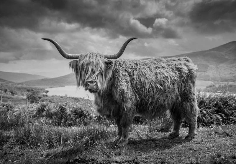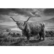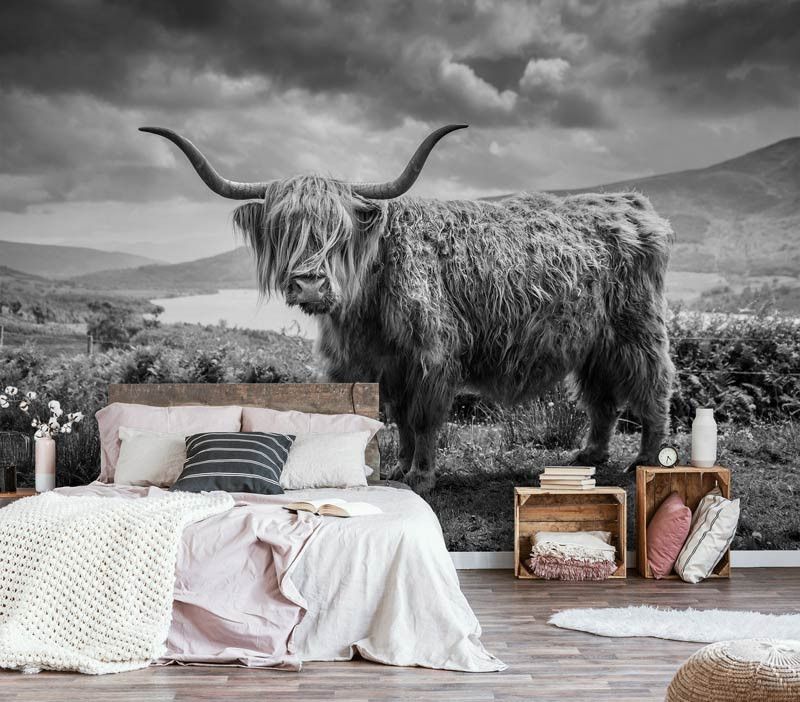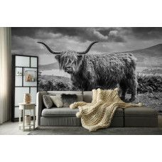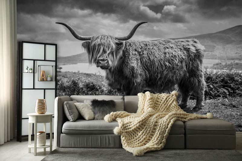 Geef je interieur een bijzondere uitstraling met dit unieke Schotse hooglander fotobehang in zwart-wit.