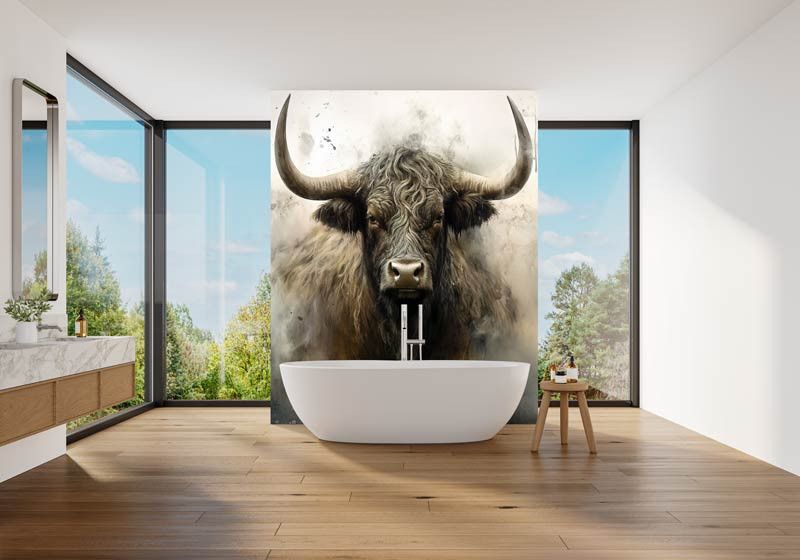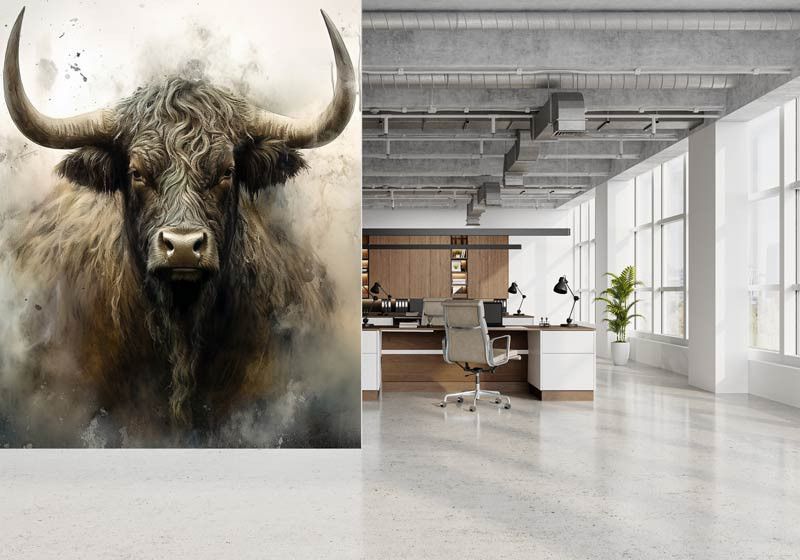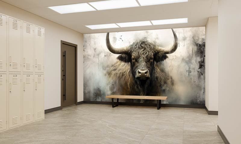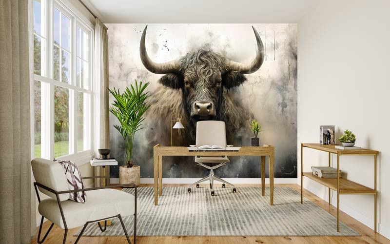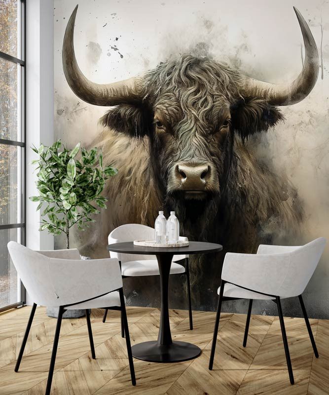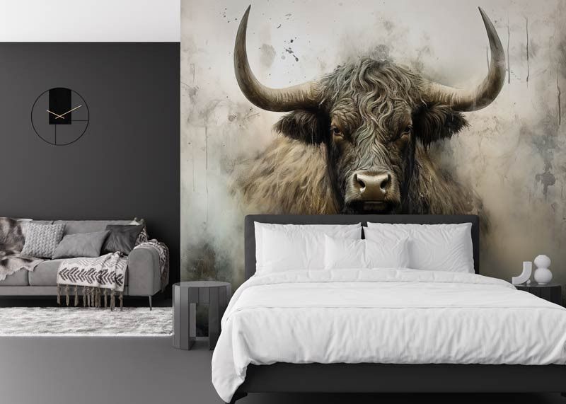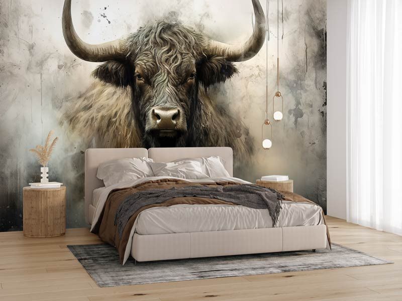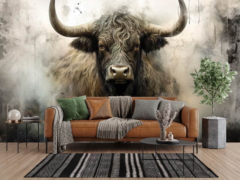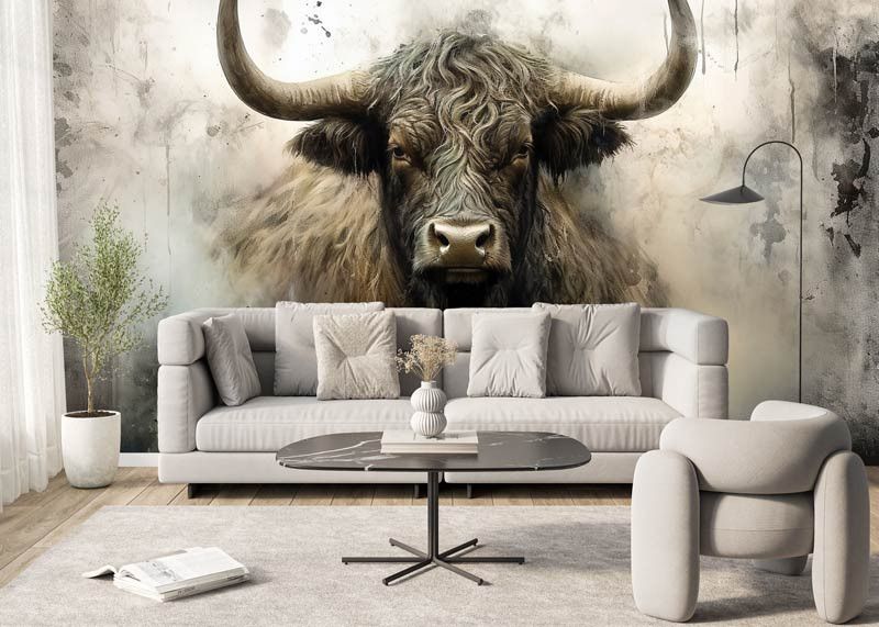 Dit fotobehang toont een krachtige Schotse Hooglander frontaal in beeld, met lange hoorns, een ruige vacht en een intense blik. De industriële achtergrond bestaat uit ruwe texturen, vergrijsde tinten en een licht verweerde uitstraling, waardoor het dier extra kracht en karakter uitstraalt. Het contrast tussen het robuuste dier en de abstracte achtergrond zorgt voor een opvallend en artistiek geheel.