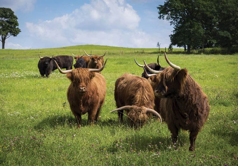Fotobehang van schitterende Schotse Hooglanders in het weiland.