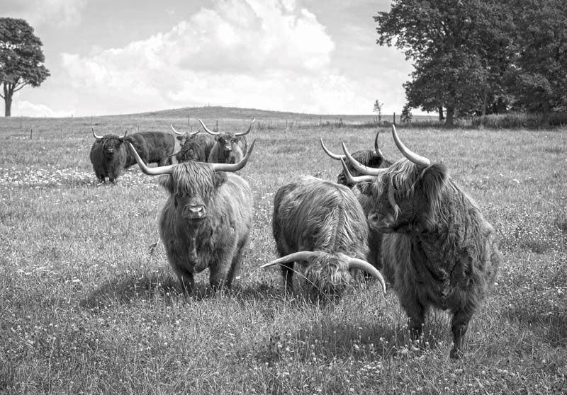 Fotobehang van schitterende Schotse Hooglanders in het weiland, weergegeven in zwart-wit.