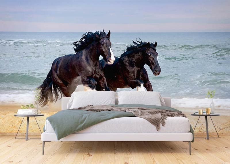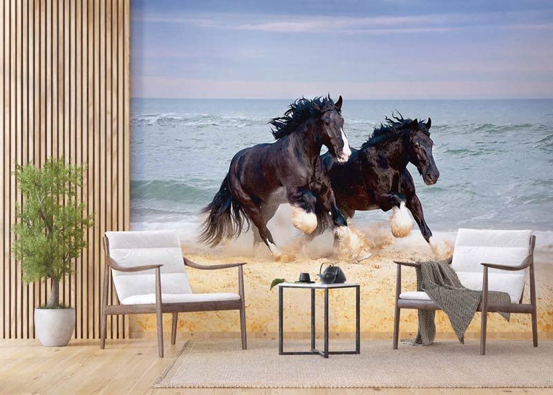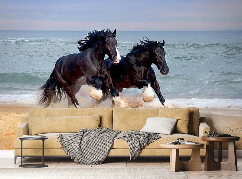 Geniet van de rust en vrijheid van Shire paarden die langs een zandstrand galopperen. De natuurlijke tinten van de lucht en het strand brengen een kalmerende sfeer in de ruimte. Dit fotobehang is gemakkelijk op maat te bestellen, perfect voor liefhebbers van paarden en natuur.