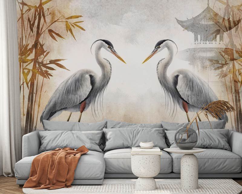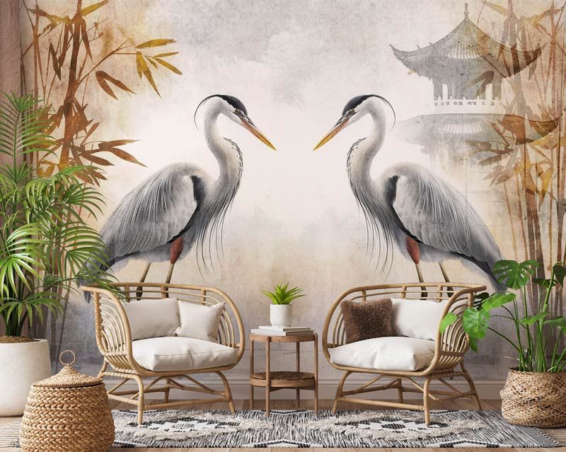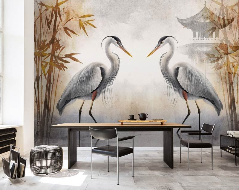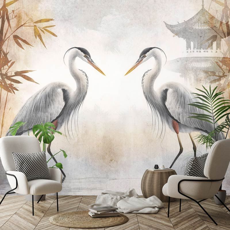 Voeg een exotische en elegante sfeer toe aan je interieur met fotobehang sierlijke reigers. Dit prachtige ontwerp toont sierlijke reigers te midden van rode bladeren en een charmant Japans huisje, wat zorgt voor een unieke en rustgevende uitstraling. De combinatie van levendige kleuren en verfijnde details maakt dit behang een echte blikvanger in elke ruimte.