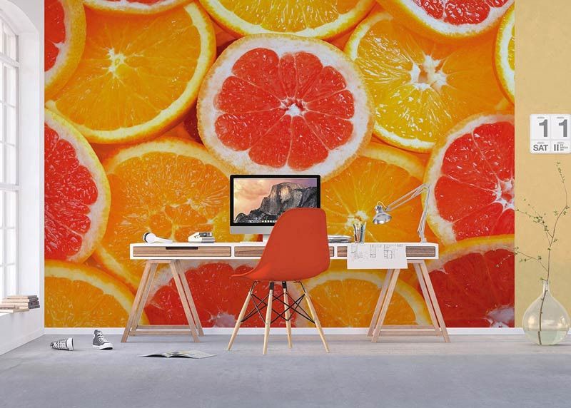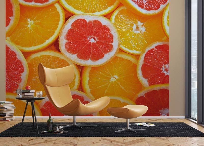 Breng een vrolijke, frisse uitstraling in je interieur met dit fotobehang van sinaasappels. De heldere oranje tinten en het gedetailleerde groene blad brengen een energieke sfeer die ideaal is voor keukens of eetkamers.