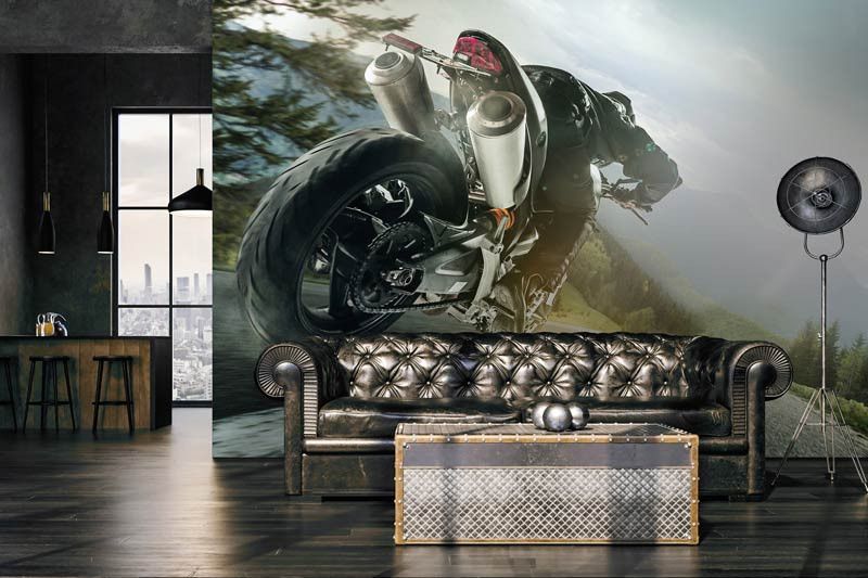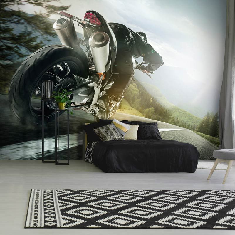 Het fotobehang is eenvoudig op maat te bestellen door de gewenste maten in te vullen en het deel van de print te selecteren dat het beste past. De haarscherpe print brengt de details van de motor, de bergen en de weg prachtig naar voren, waardoor het geheel tot leven komt. Laat je inspireren door snelheid en natuur met dit unieke fotobehang.