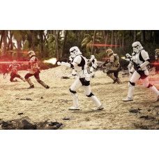 Fotobehang van de strijd bij Scarif Beach. De Stormtroopers en de Imperial kemphanen in het kruisvuur van de rebellen rond Jyn Erso.