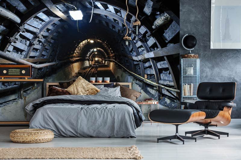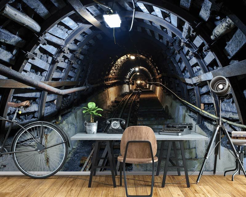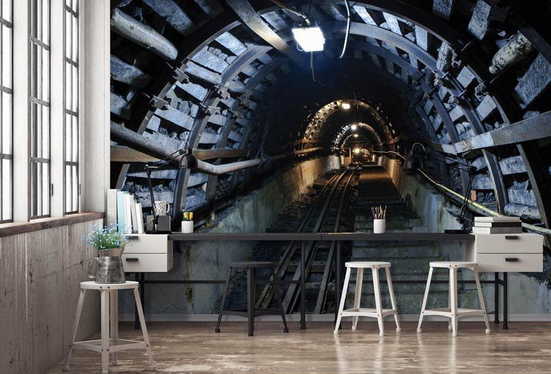 Vliesbehang van een steenkolenmijn. De lange tunnel zorgt voor een geweldig 3D-effect!