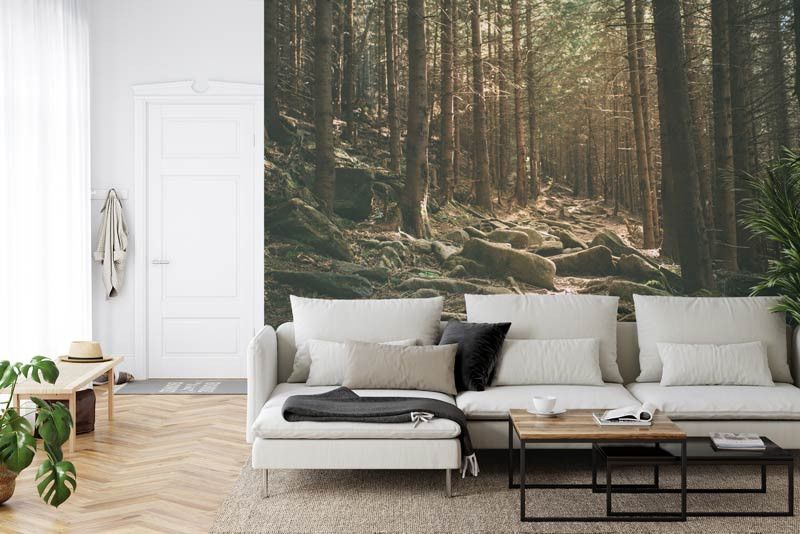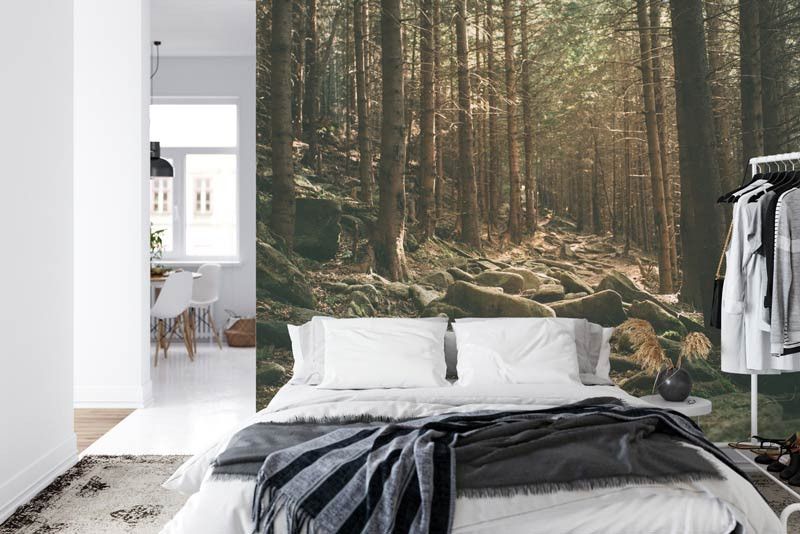 Verlies jezelf in de harmonie van de natuur met Fotobehang Stenen in het Bos. Ontdek de verstilde schoonheid van stenen die tussen de bomen liggen, en laat je meeslepen door de rust en sereniteit van dit betoverende landschap.
