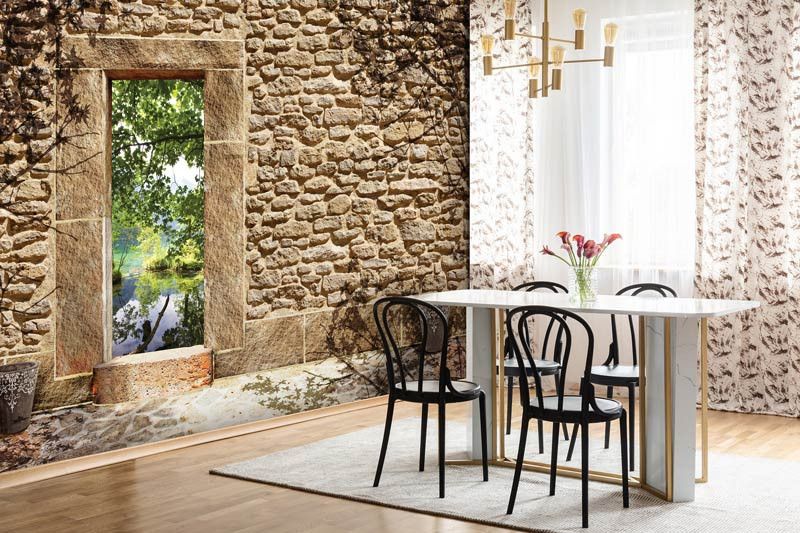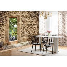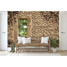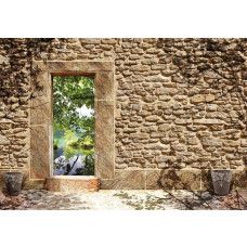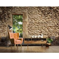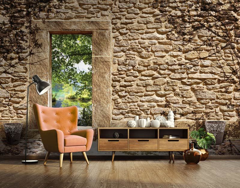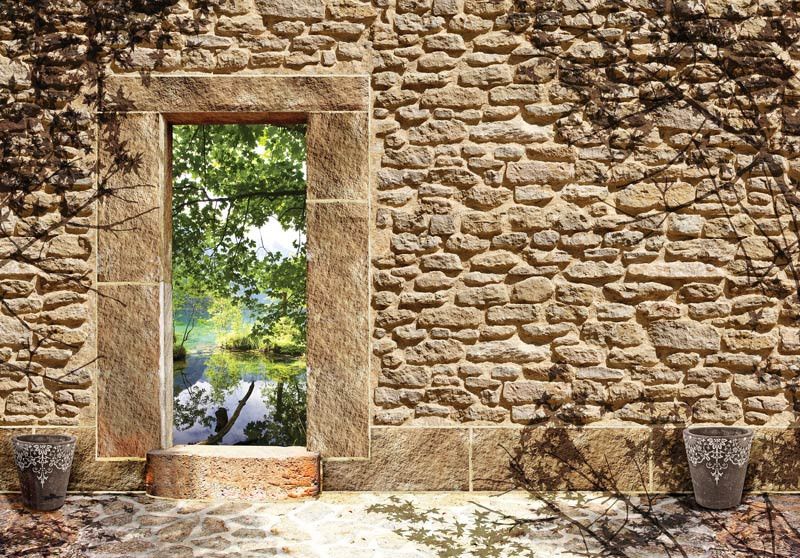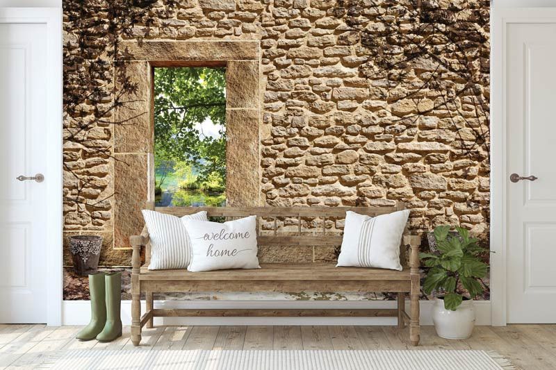 Vliesbehang met daarop een oude stenen muur met een opening met uitzicht op een vijver. De opening in de muur zorgt voor een geweldig, 3D effect.