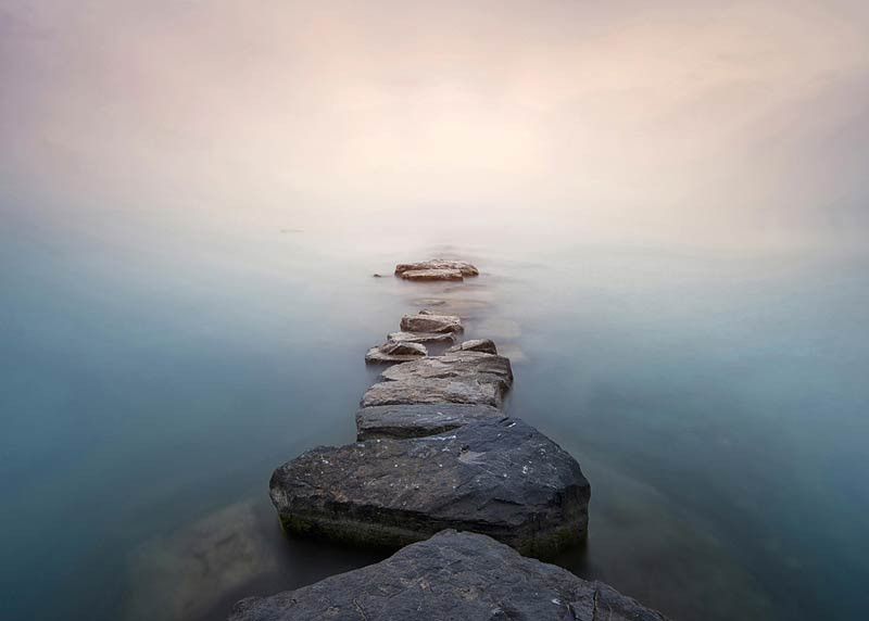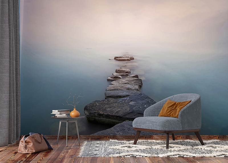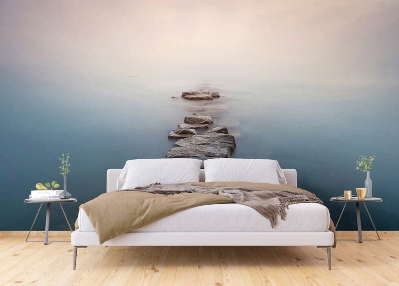 Geniet van de rust van de natuur met dit fotobehang van een stenen pad in helder water. De koele, natuurlijke kleuren geven een serene en kalmerende uitstraling aan de kamer.