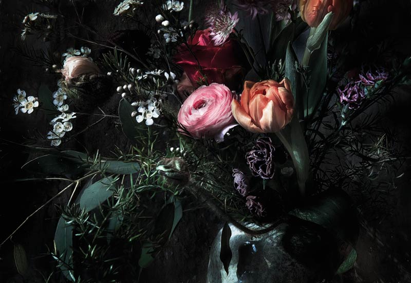Romantisch stilleven voor aan de muur! De heldere bloesems van het bloemboeket contrasteren mooi met de donkere achtergrond en creëren een romantische sfeer in iedere ruimte.