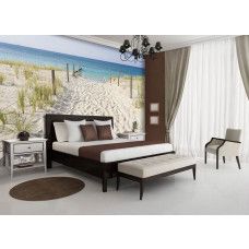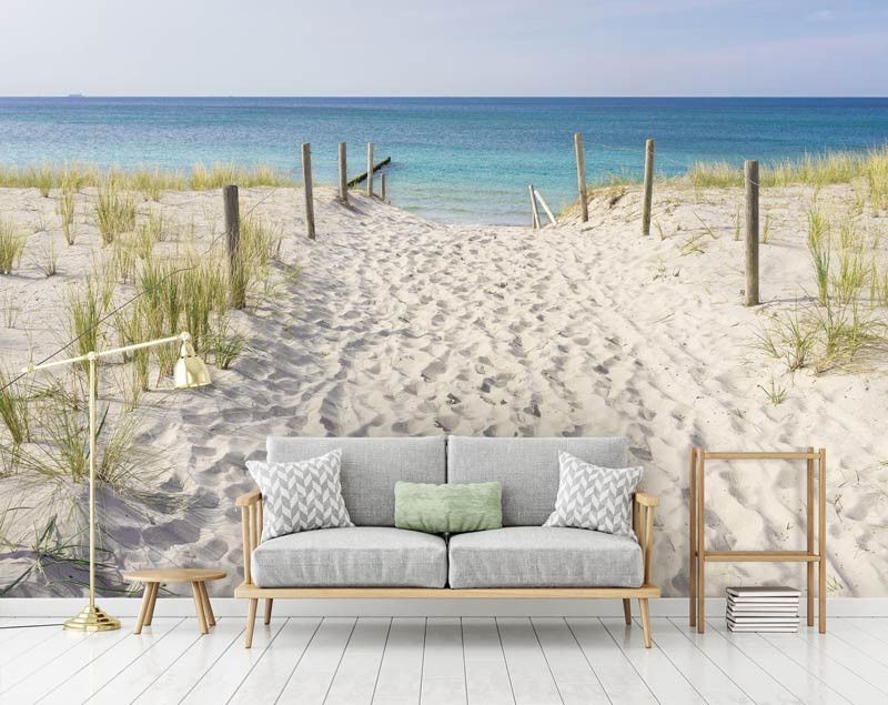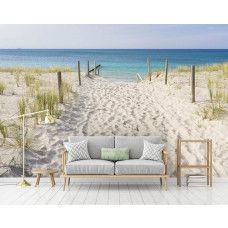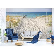 Vlies fotobehang van een voetpad van zand, dat tussen de duinen door richting de zee loopt.